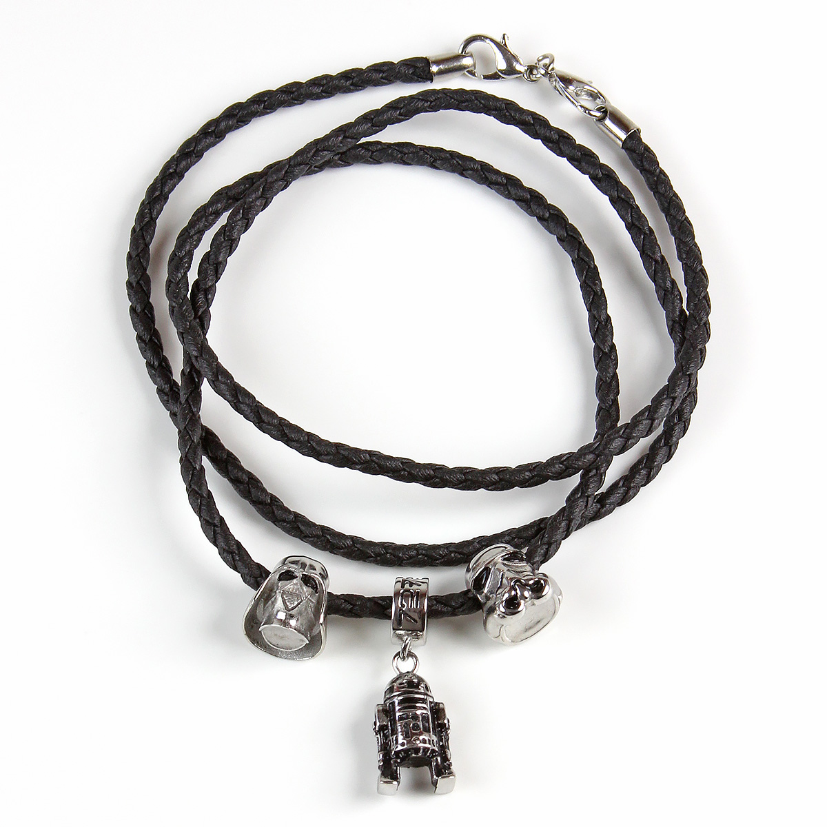 I chose the black leather bracelet from Thinkgeek to pair with these bead charms. It isn’t pictured on Thinkgeek’s Star Wars bead charm page, and only a small image on the European charm page, which is a little frustrating. It is not part of the Body Vibe collection, instead made by a company called Pugster. The bracelet came packaged in a nice black gift box with padding and brand tag. The bracelet measures approximately 73cm long, with the clasps adding another 2.5cm. The clasps are two ‘lobster claw’ style clasps joined to each other, so you can unclip them from either end of the bracelet to add/remove beads. The bracelet is designed to be worn wrapped several times around the wrist – but it’s length means it can also be worn as a necklace. This is a great set, I’m really happy to add it to my wardrobe.
