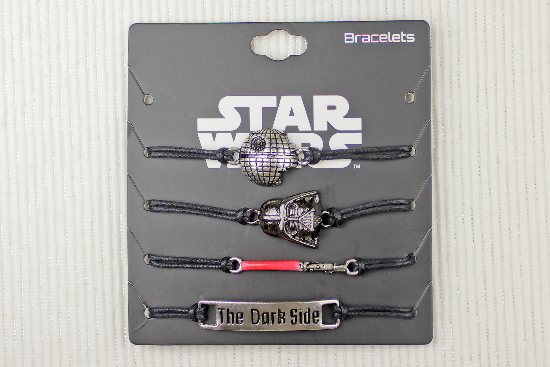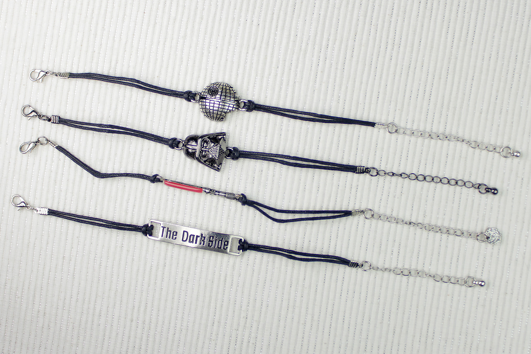 Come to the Dark Side. We have a cord bracelet set from Star Wars with Death Star, Darth Vader, lightsaber and “The Dark Side” pendants.