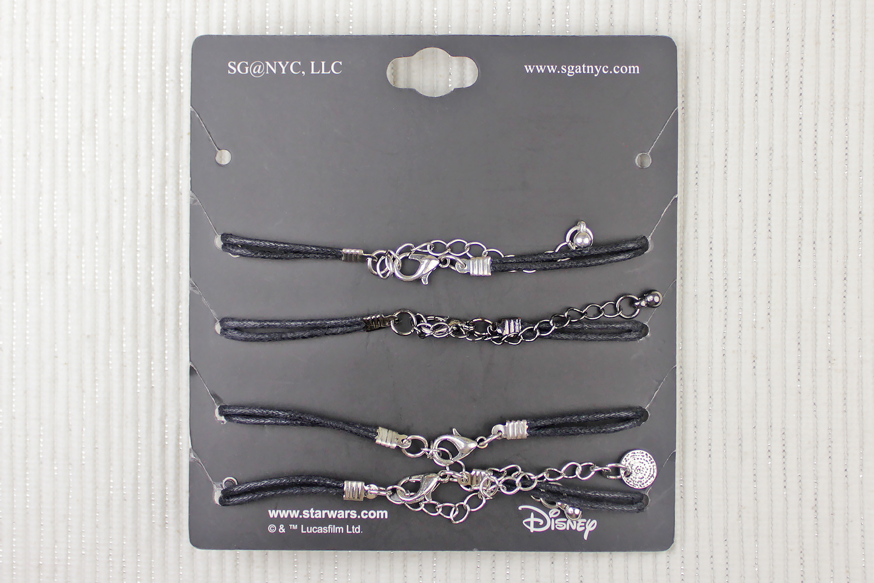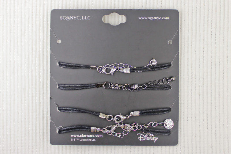 The set came packaged on a black cardboard backing card. The front features the Star Wars logo printed in white, while the back features the SG@NYC and Disney logos, along with website information. The bracelets are held in place with little slotted holes on each side of the backing card.