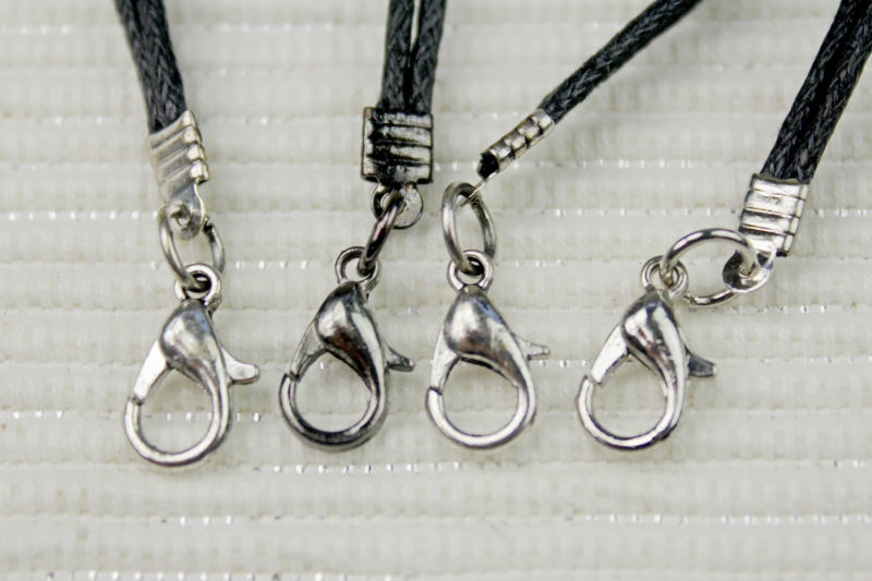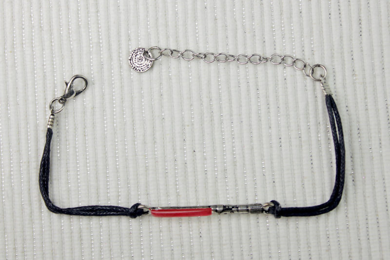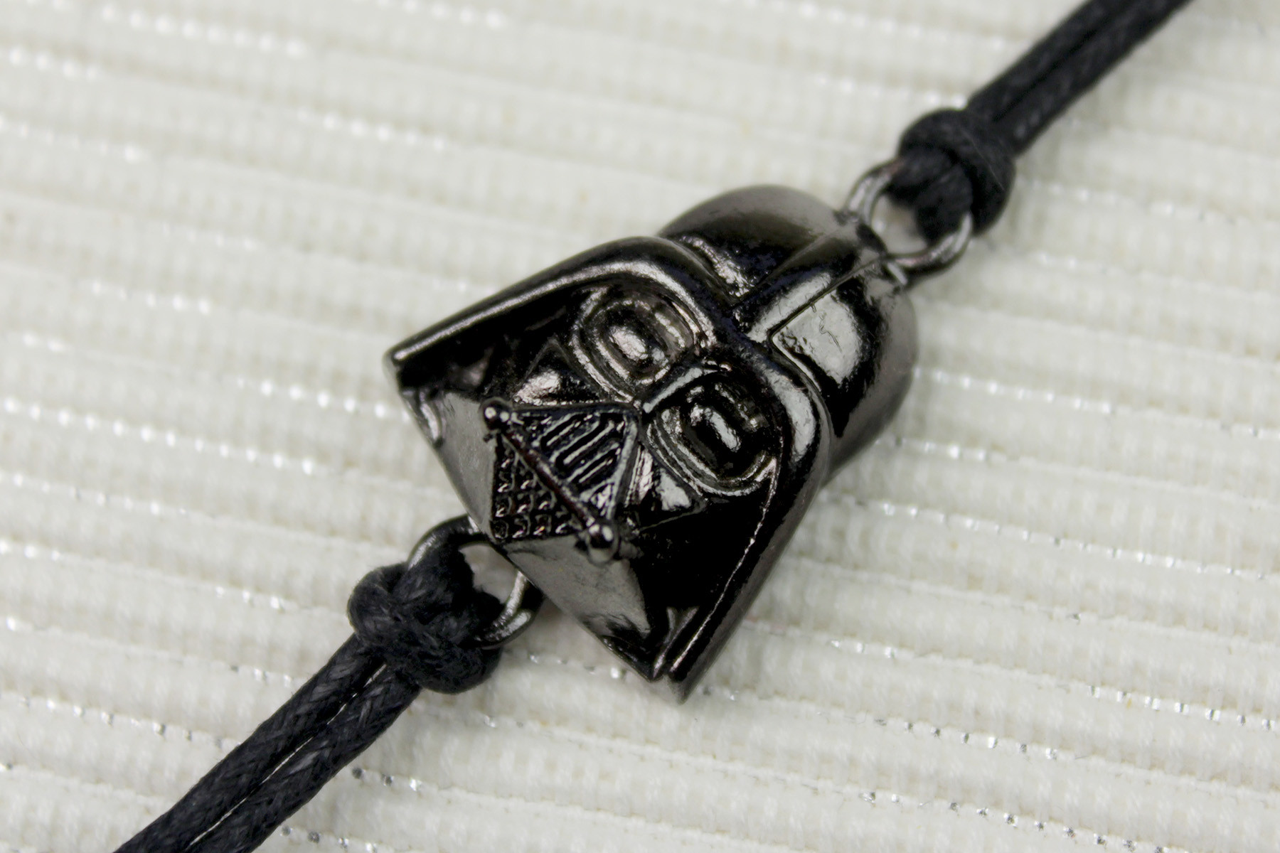 Each bracelet features a central metal pendant, with a different Dark Side themed design for each one – Darth Vader’s helmet, Darth Vader’s lightsaber, ‘Join The Dark Side’ text, and the second Death Star. The pendants are held in place with a loop of black braided cord at each end – though I am not sure if this is real leather or faux leather cord. In my photos, the cords have a few kinks from being stored on the card, but these ease out nicely with weearing.