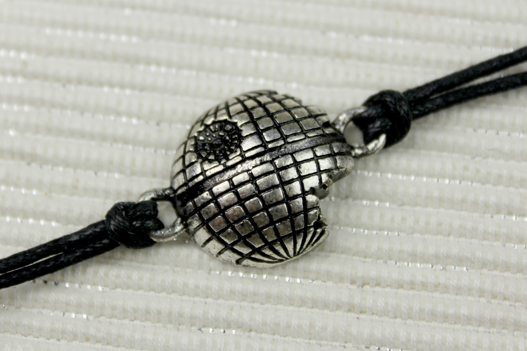 The Death Star bracelet features a 3D sculpt of the second Death Star from Return of the Jedi. The pendant isn’t a true half sphere, it is much flatter, but still has a good curved shape. The surface features recessed lines and the super laser detail, accented with black antiquing. The right side edge features some ‘cut outs’ to give the unfinished appearance of the second Death Star – though the lower cut out kinda looks like a bite out of a cookie…