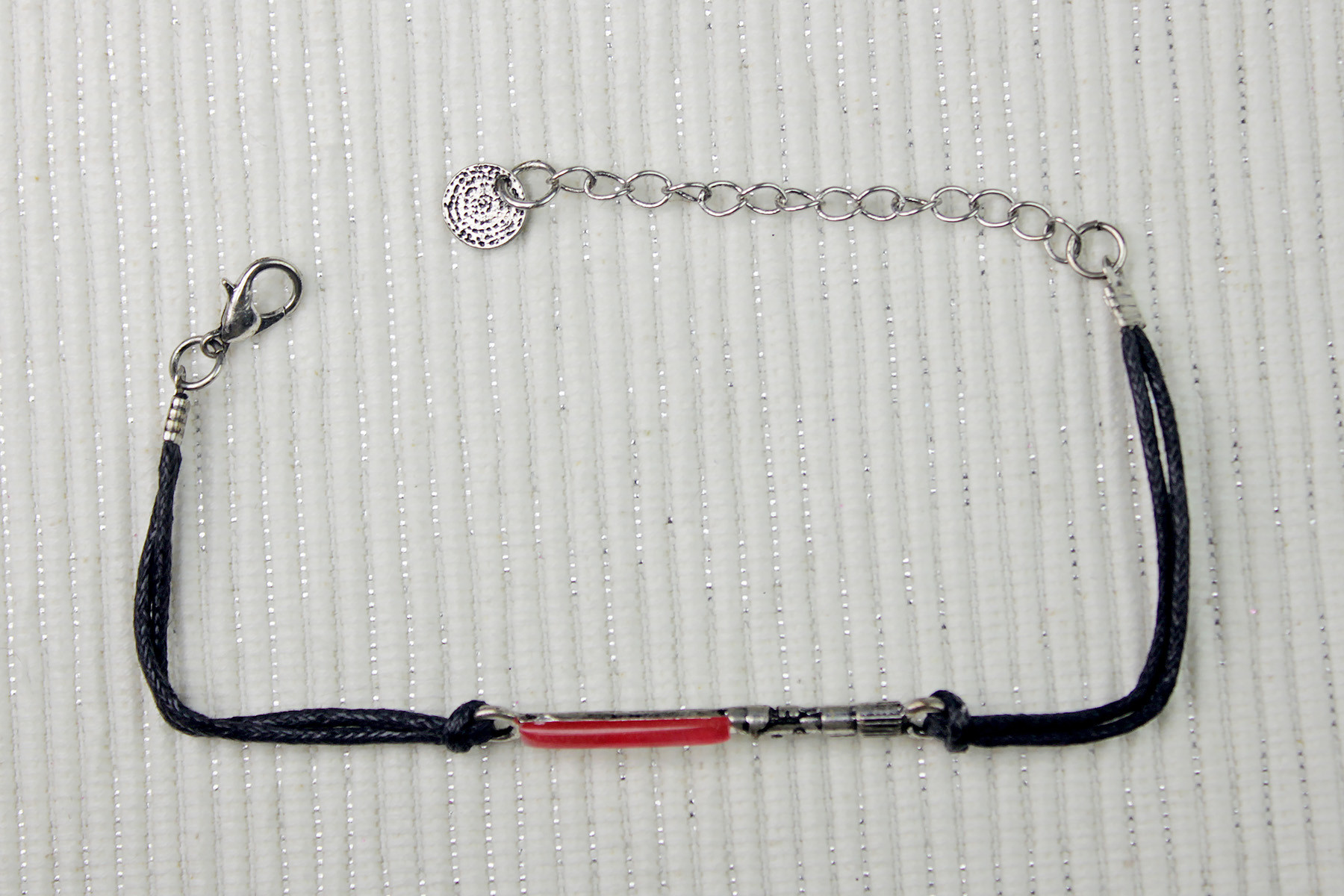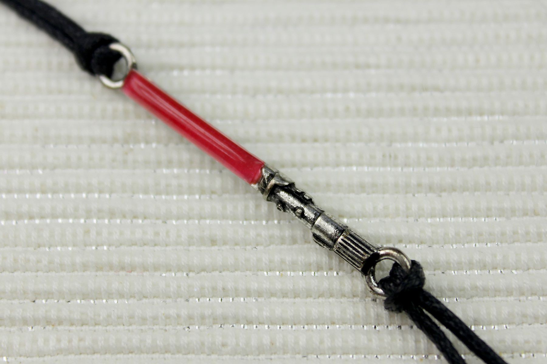The lightsaber bracelet features a 3D sculpt of Darth Vader’s lightsaber, with a raised red plastic detail for the lightsaber blade. When viewed from the side, the plastic covering appears to have a red base, with a domed clear coating, which gives a rounded shape to the blade. The hilt sculpt is really nice, with the fine detail accented with black antiquing. The lightsaber pendant measures approximately 3.5cm by 0.4cm (at the widest parts, not including the end rings). Fans with slender wrists may wish that this lightsaber pendant was curved, as it sits straight across your wrist.