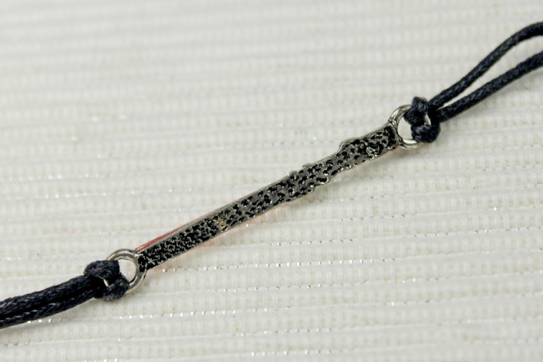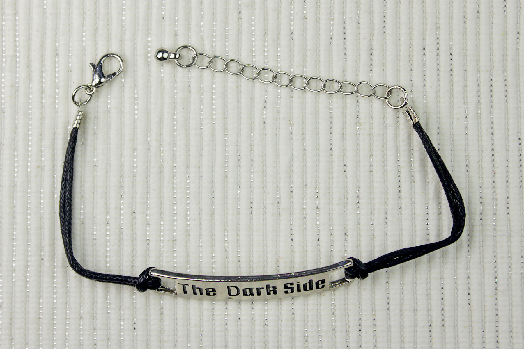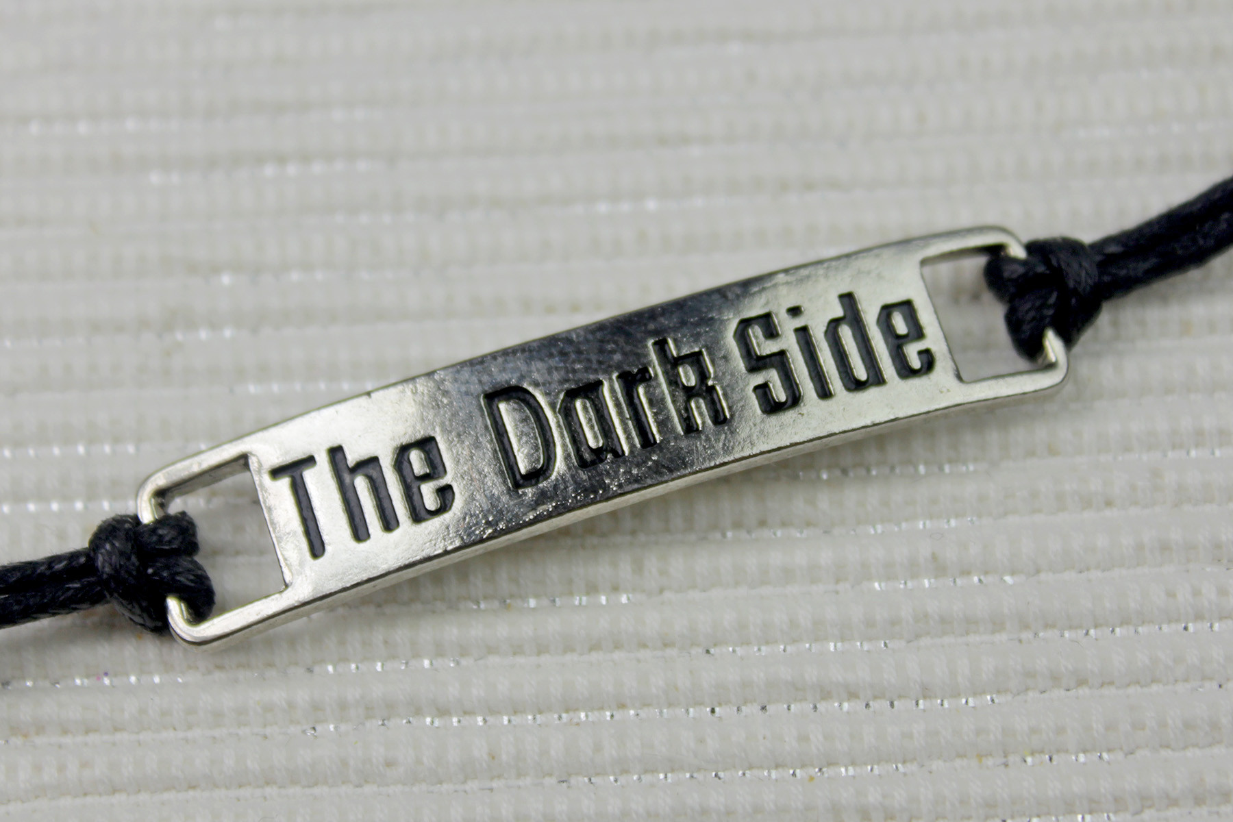 The Dark Side bracelet features a flat silver tone panel pendant, with the text ‘The Dark Side’. The text is recessed, and accented with black. The surface of the pendant has subtle texture, which matches the style of the bracelet set. The pendant measures approximately 1cm wide by 3.1cm long, or 4.4cm long if you include the end loop holes (measured curved).