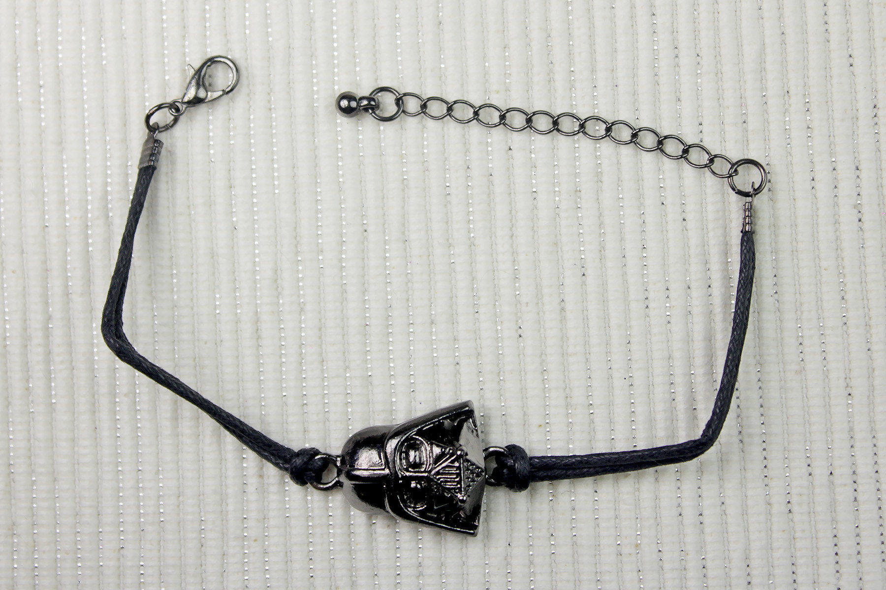The bracelets are adjustable, with a lobster style clasp at one end, and a short length of adjustment chain at the other end. The bracelets each measure approximately 18.5cm long (including clasp), with a further 5cm of adjustment chain. Interestingly, 3 of the bracelets use silver tone jewelry hardware (clasp and adjustment chain), while the Darth Vader bracelet uses dark gunmetal tone hardware.