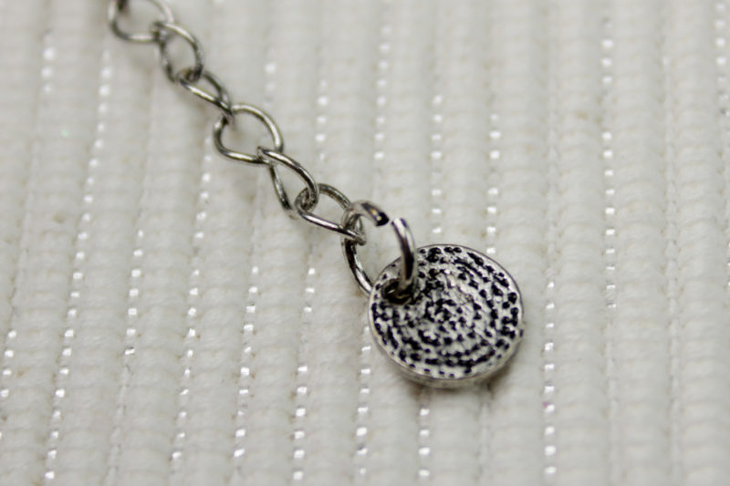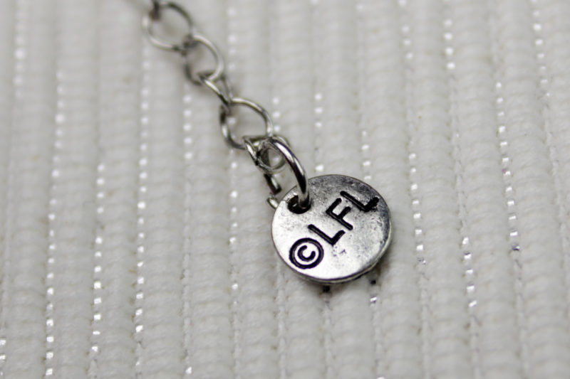 The back of the pendant is hollow, and features the standard ‘© LFL’ copyright stamp. The back hollow is also accented with black antiquing, just like the front. This keeps a uniform appearance, even though of course the back isn’t seen when worn. The pendant measures approximately 2cm by 2cm (at the widest parts, not including the end rings).