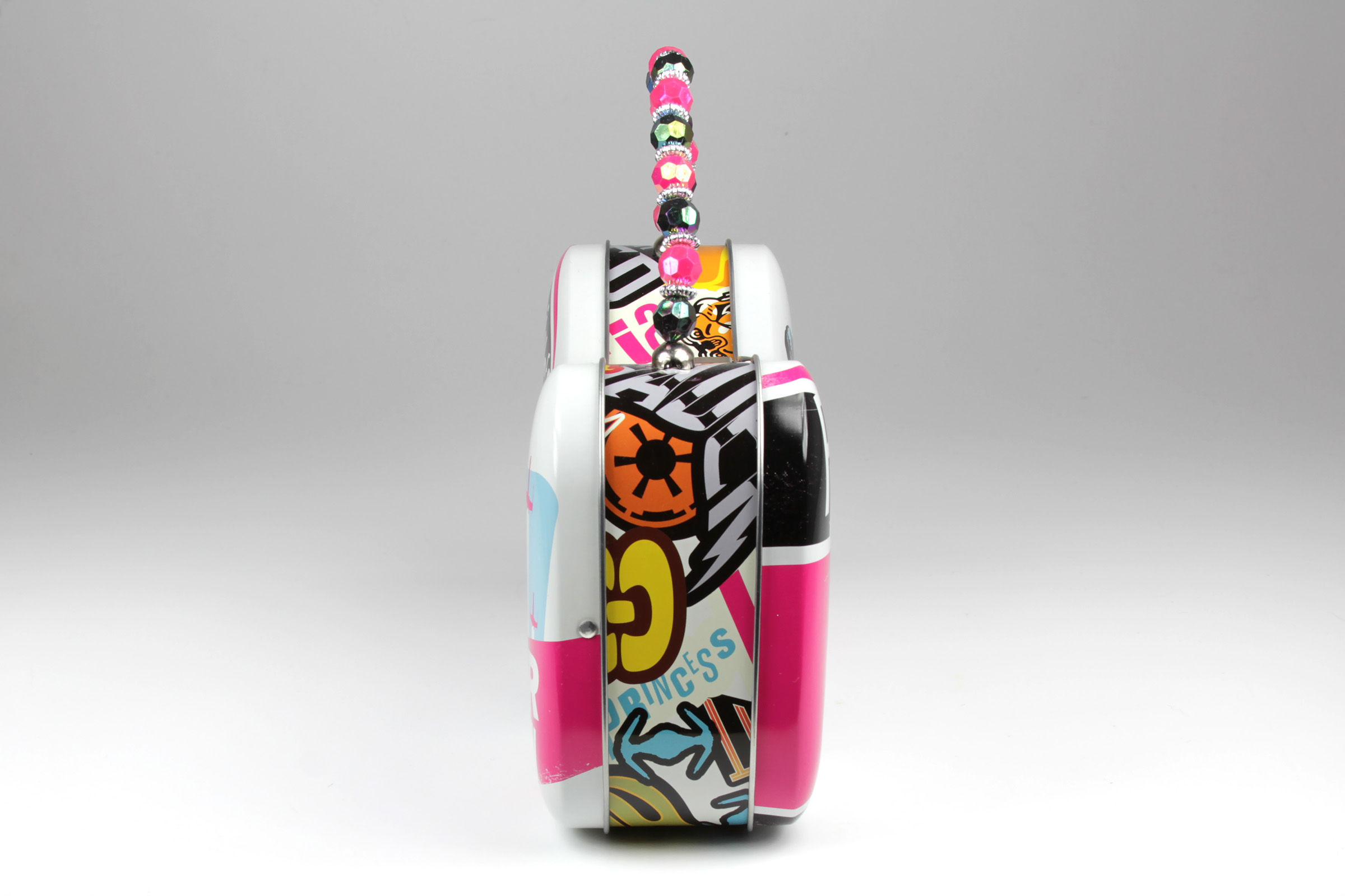 The sides of the purse feature a bright pattern inspired by 70’s era ‘groovy’ text designs. The print includes text like ‘R2-D2,’ ‘Stormtrooper’, ‘Vader’ ‘Chewbacca’, ‘Leia’, and more. This print resembles stickers, overlapped in a scattered fashion – like travel stickers on a suitcase, or concert stickers on a guitar case. Like the front panel design, this scattered print will help disguise any possible scratches much better than if a plain colour panel was used instead.