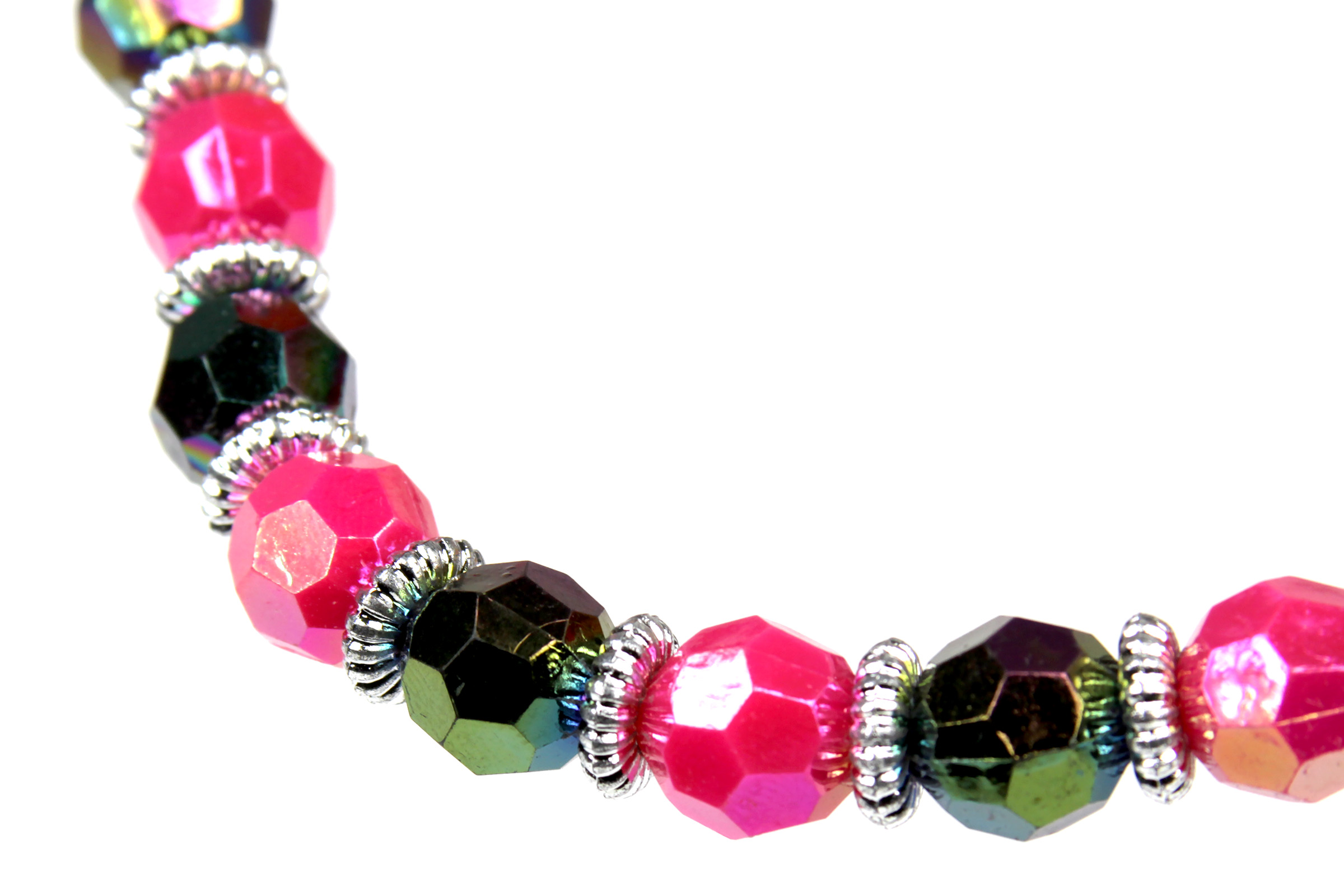 The handle is made from wire, threaded through colourful beads. There are three different styles of beads used, in a repeating pattern – a faceted pink bead, a faceted iridescent bead, and silver-toned spacer beads. The wire is not a fixed shape, it can be moved/bent so it molds to your hands a little when carrying. I was curious how holding onto chunky beads would feel, but it is surprisingly comfortable. I can easily hold the handle with heaps of clearance, or even wear it hanging on my wrist.