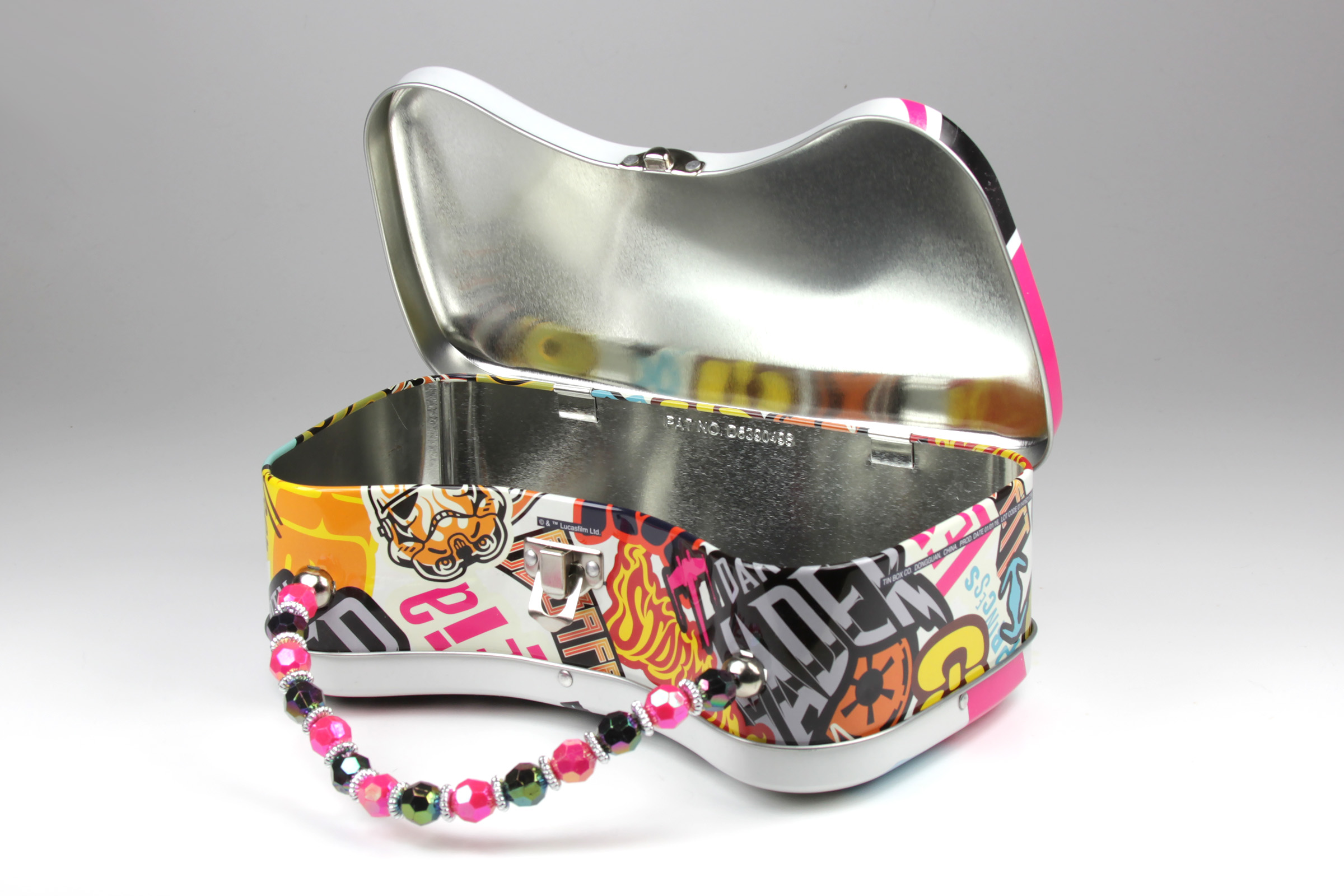 One of my concerns about tin purses – the risk of scratching the design. The artwork used for this purse actually has ‘scratched’ lines and patches of fake wear already in the print, so real scratches are far less likely to ruin the overall look. I haven’t tested this purse out on a rough surface to see how well the print holds up – but this is obviously not an ‘everyday’ handbag. This design is better suited for selected occasions, so the risk of damage is less than for a bag you would use everyday for carrying all your essentials.