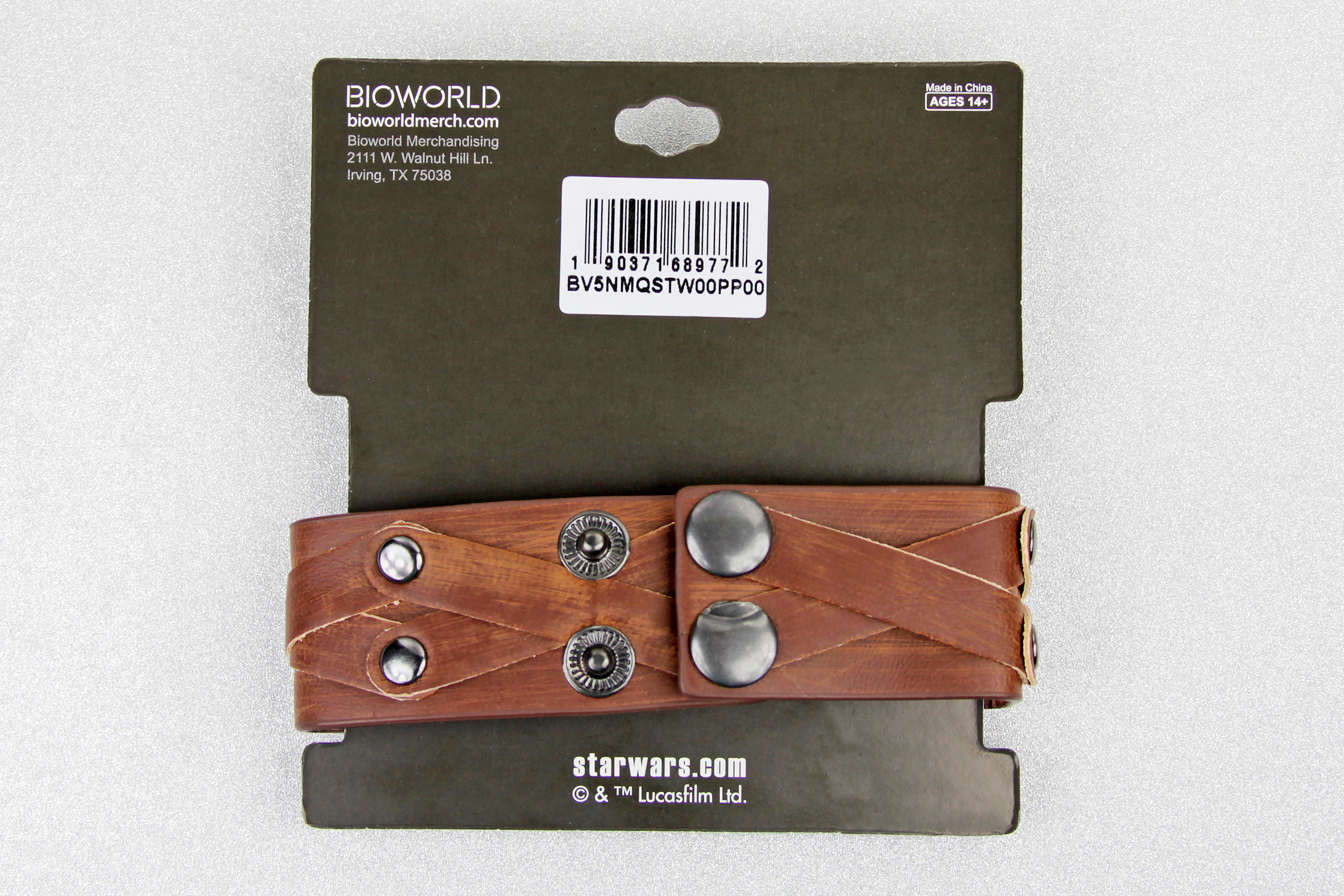 The bracelet came packaged on a black cardboard backing card, with the bracelet wrapped around the card. The front of the card is printed with the Star Wars logo, while the back of the card features the Bioworld company information, item barcode, and the Lucasfilm copyright information.