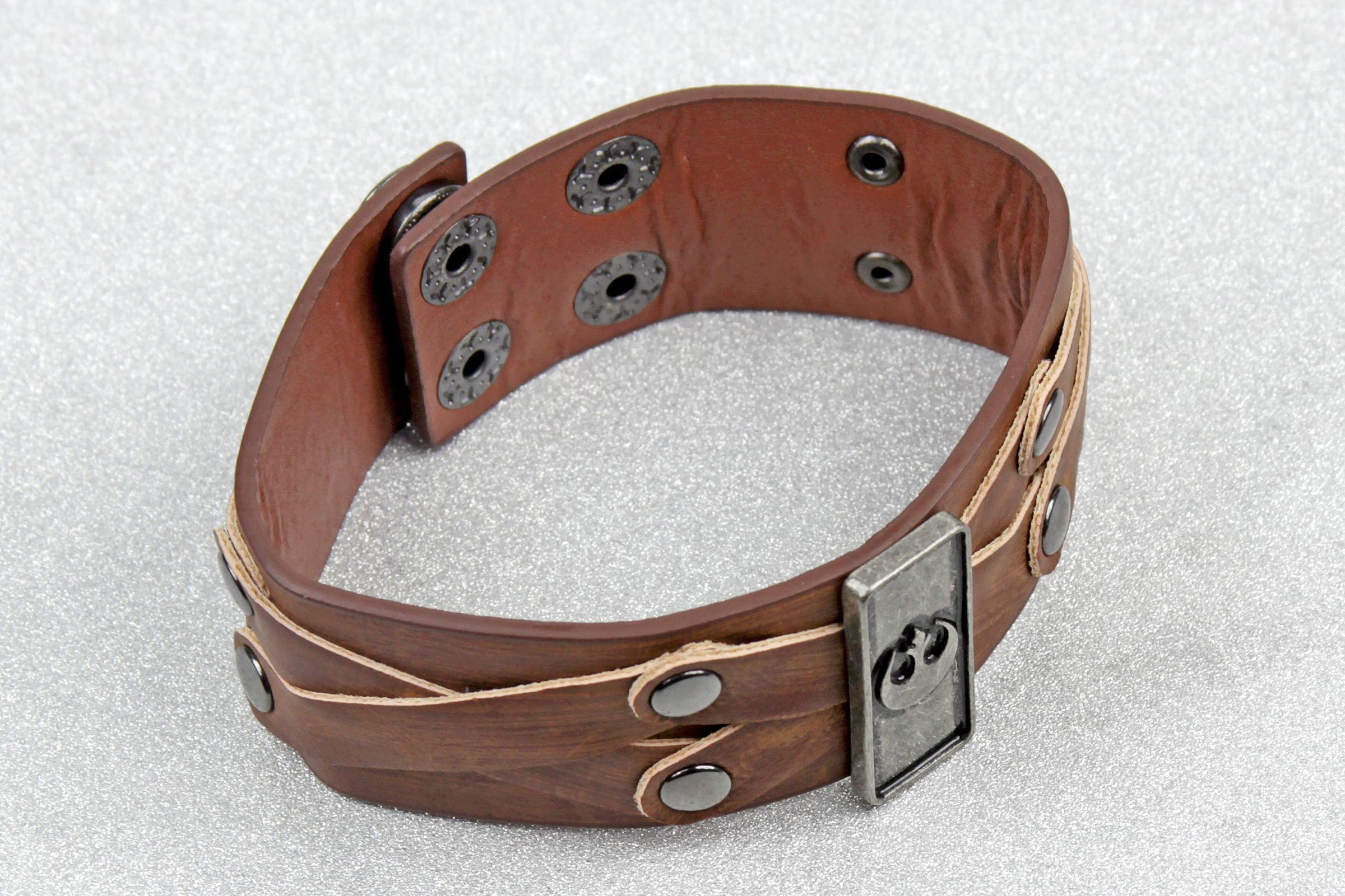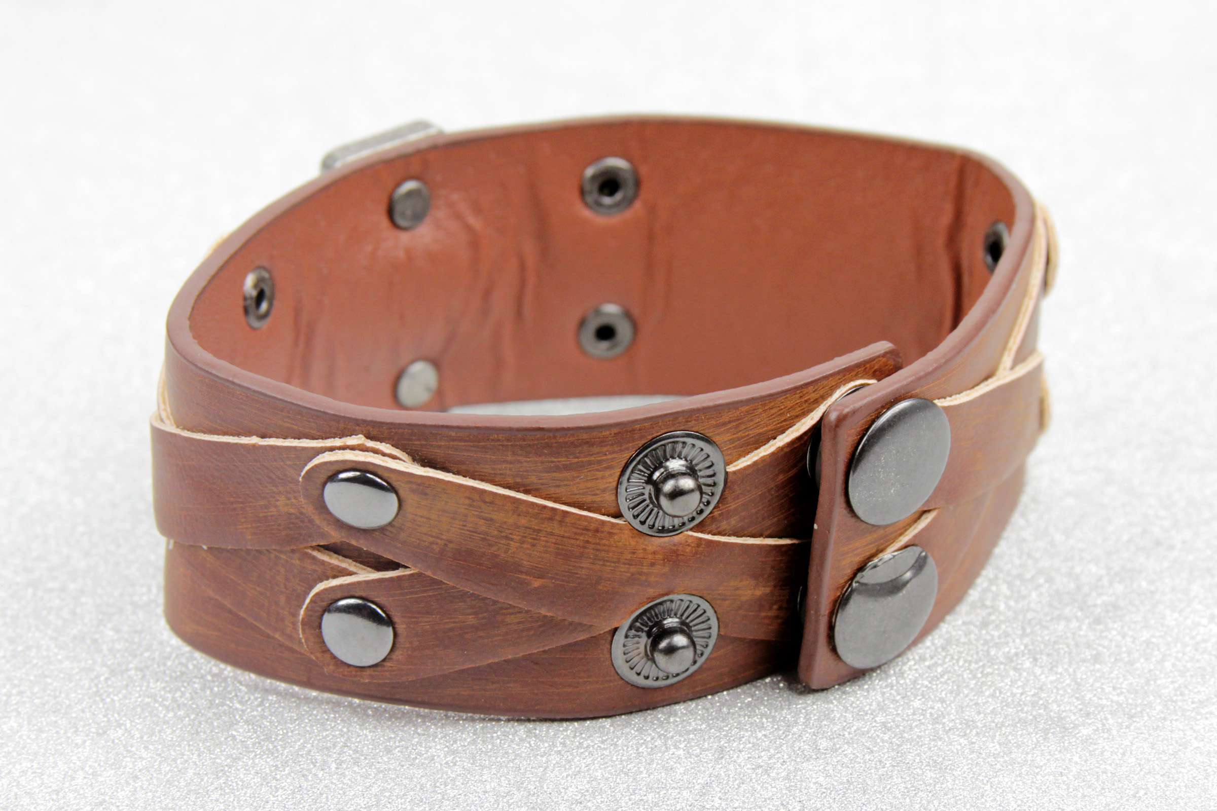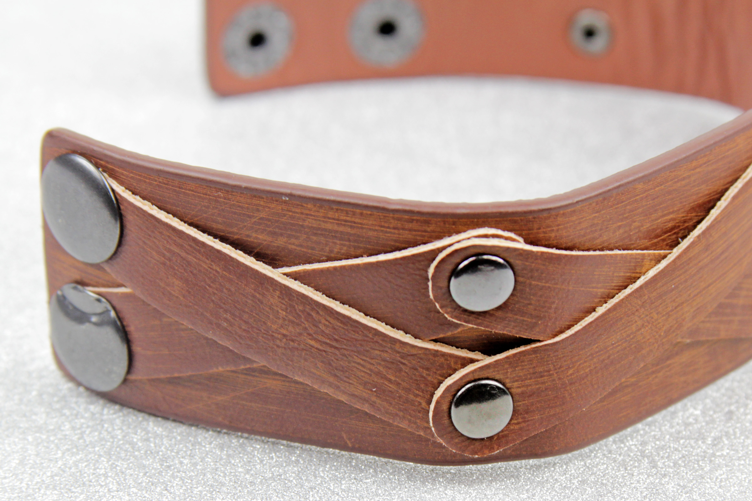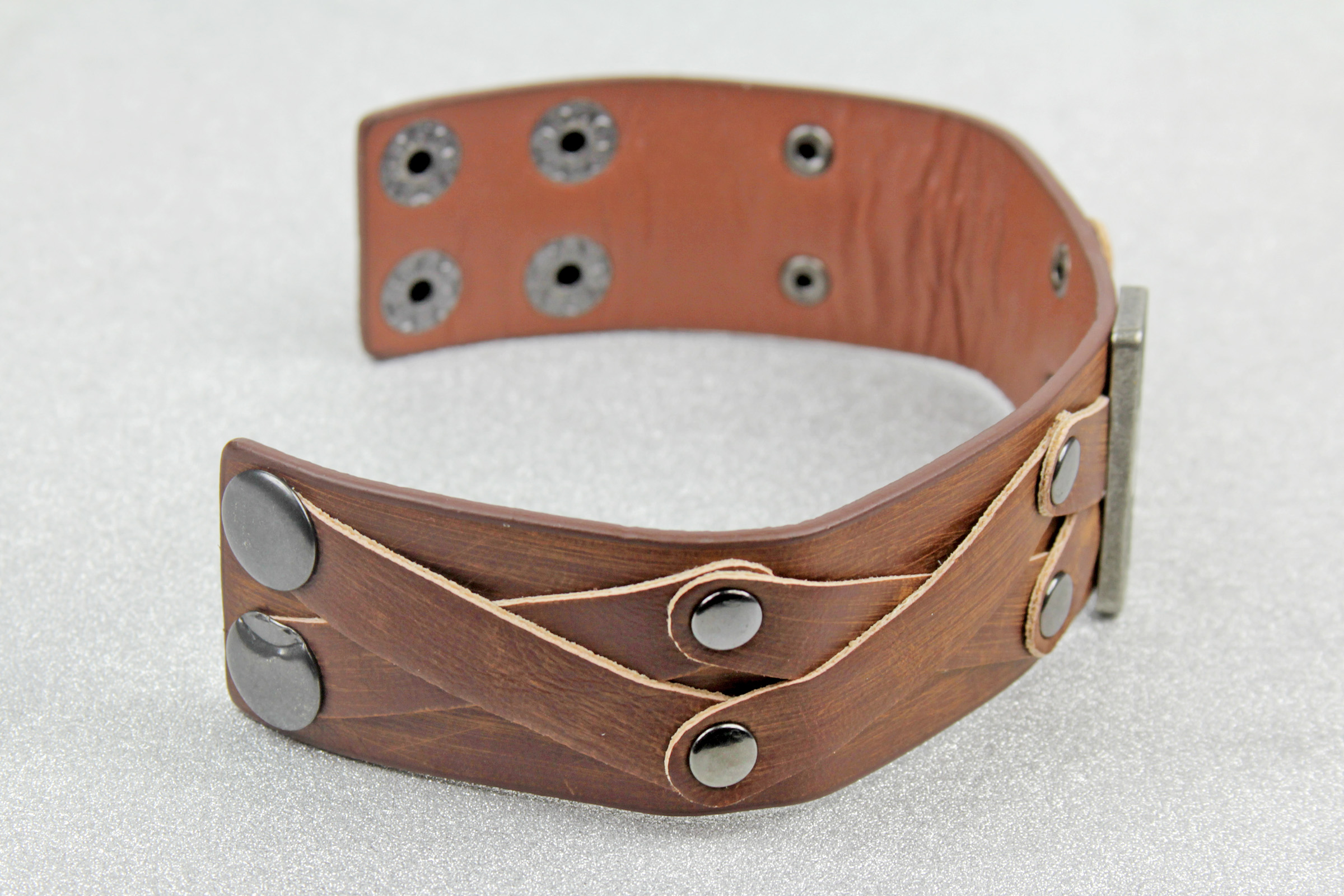 The bracelet has an additional layer of overlapping strips, which are arranged in a ‘criss-cross’ pattern along the band. The strips are held in place with small gunmetal-colour metal studs at each end (total of 8 along the bracelet). These studs are riveted on, with the backings visible on the inside of the bracelet band. The edges of these strips are left raw – that is, not painted dark brown like the edges of the main bracelet band.