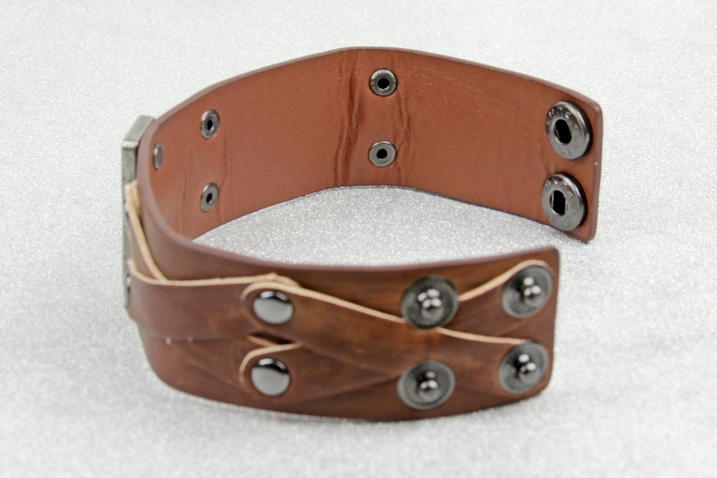 The Rebel Symbol bracelet is made from brown faux leather, with a main wide band decorated with strips and a central symbol plaque. The faux leather has a brushed surface, with a two-tone brown colour. This brushed effect works well with the weathered style of the metal symbol plaque, and helps give the faux leather a more realistic leather appearance.