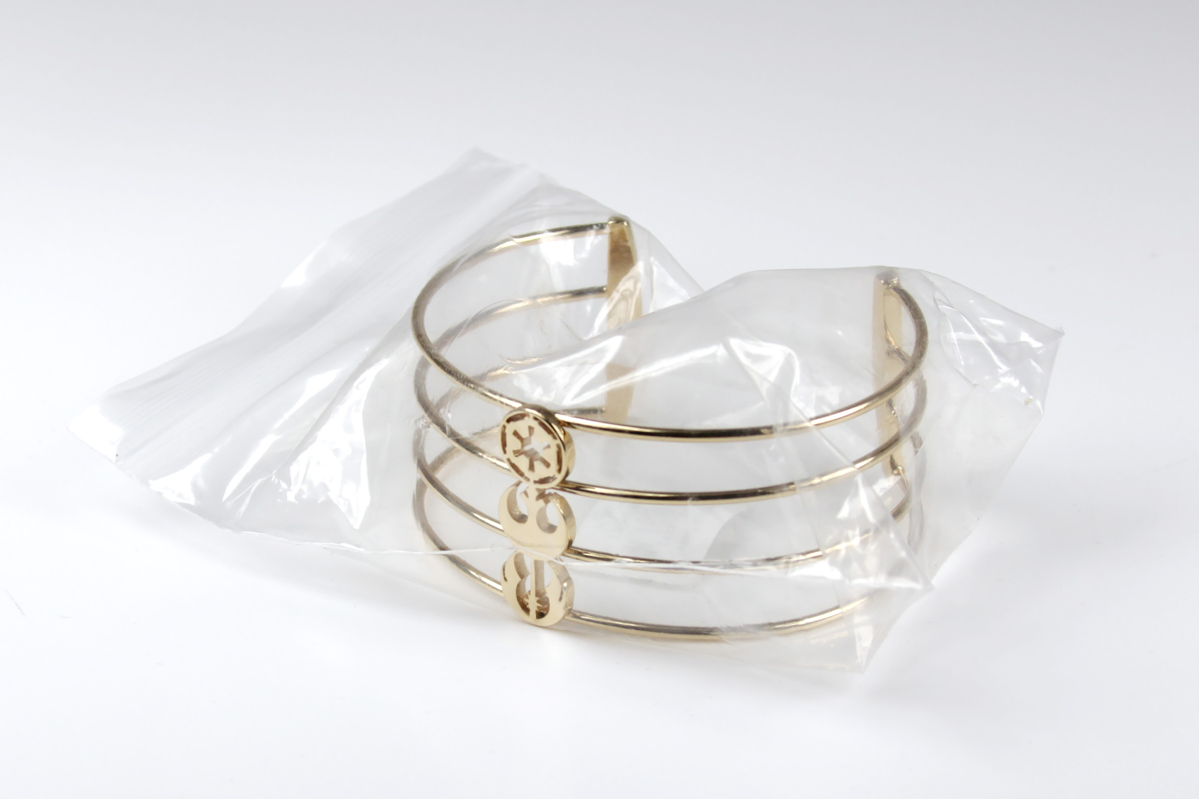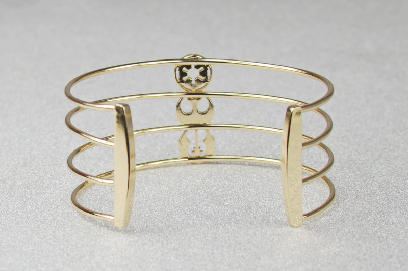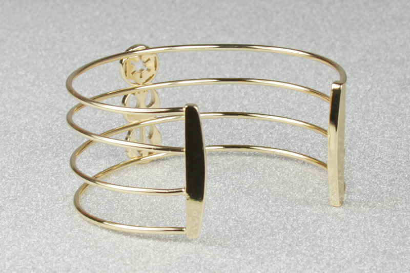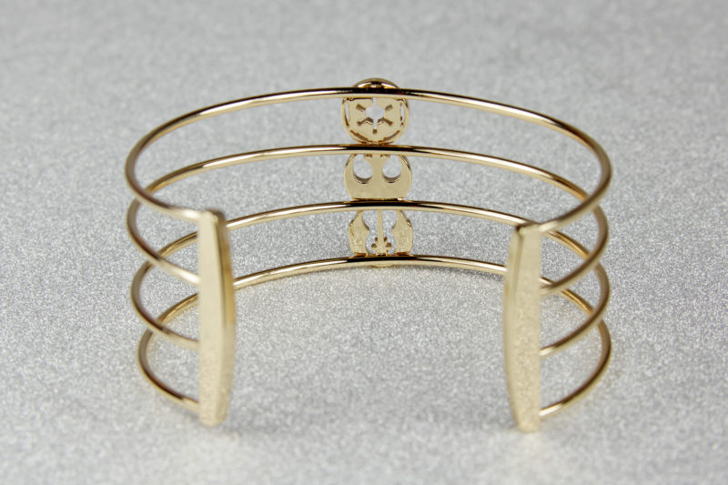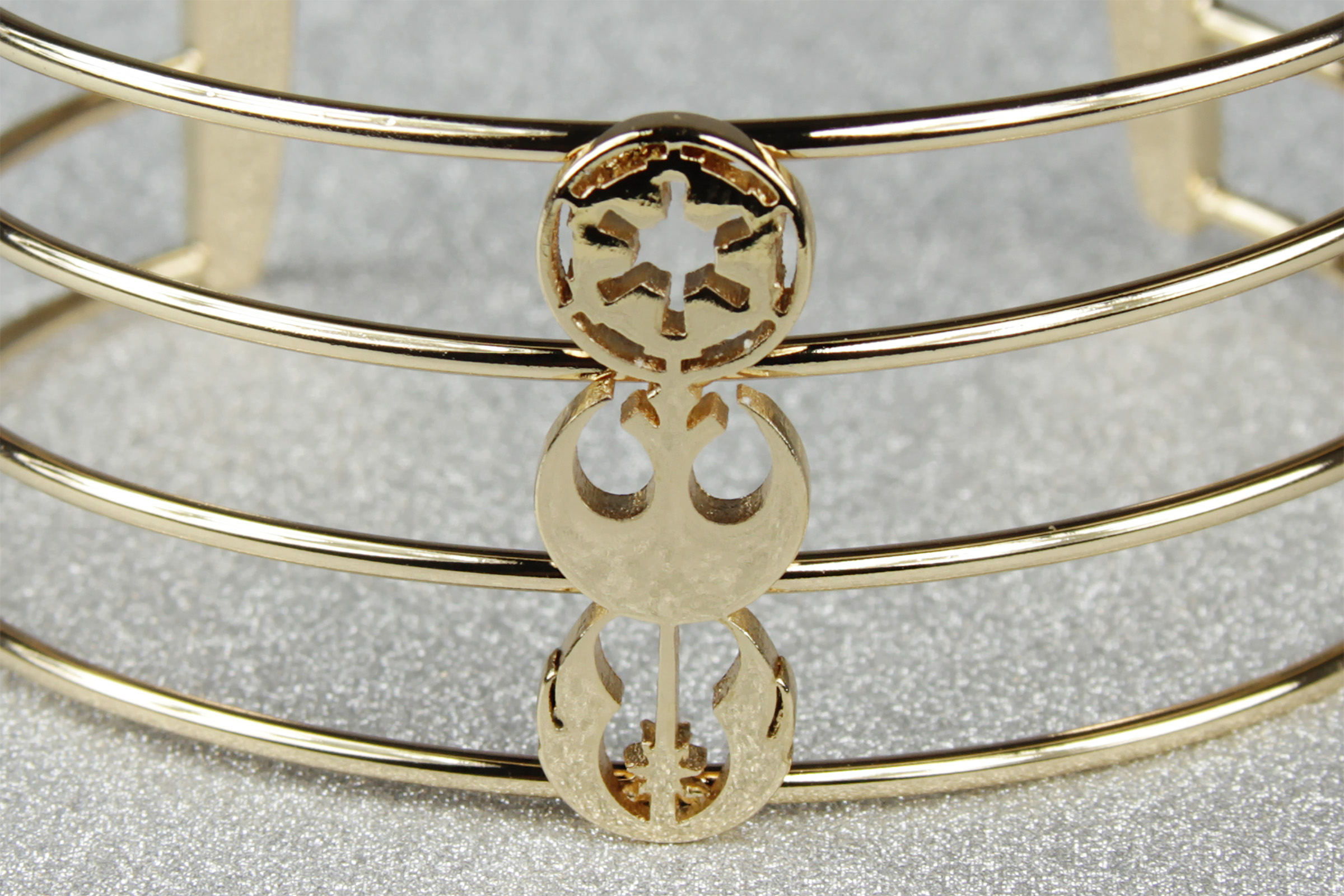The Star Wars symbols cuff bracelet features an open-ended cage design, with four gold-tone wire bands held together at each end, and in the center. The front of the bracelet features three classic Star Wars faction symbols – Galactic Empire, Rebel Alliance, and Jedi Order. The bracelet has a gorgeous shiny yellow gold-tone finish.