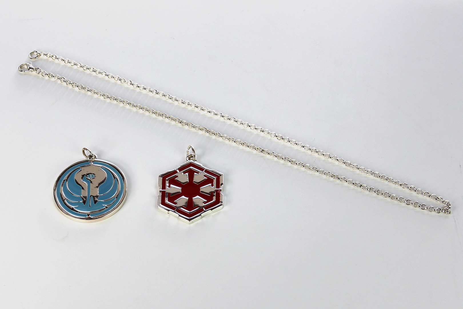 Shortly after the launch of the mmorpg Star Wars: The Old Republic, game apparel company Jinx released a line of SWTOR t-shirts and accessories. Included in the collection were two logo necklaces, for the two main factions in the game – the Old Republic and the Sith Empire. Being a huge fan of the game (I have been playing/subscribing since beta testing), I had to have the necklaces for my wardrobe. Unfortunately Jinx no longer makes SWTOR items, so I’m glad I was able to pick these up when I did.
