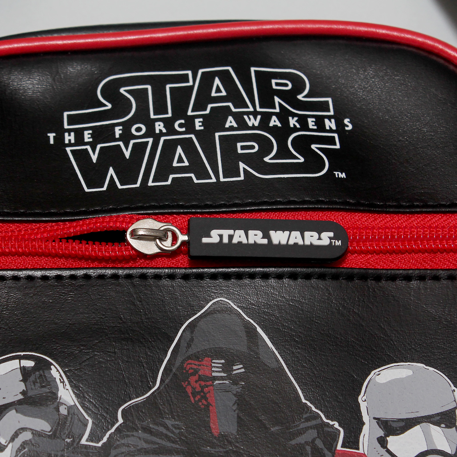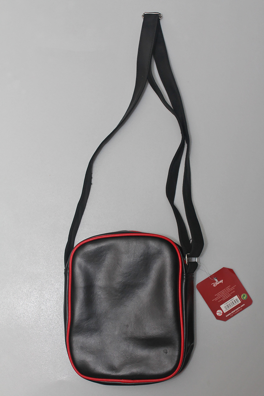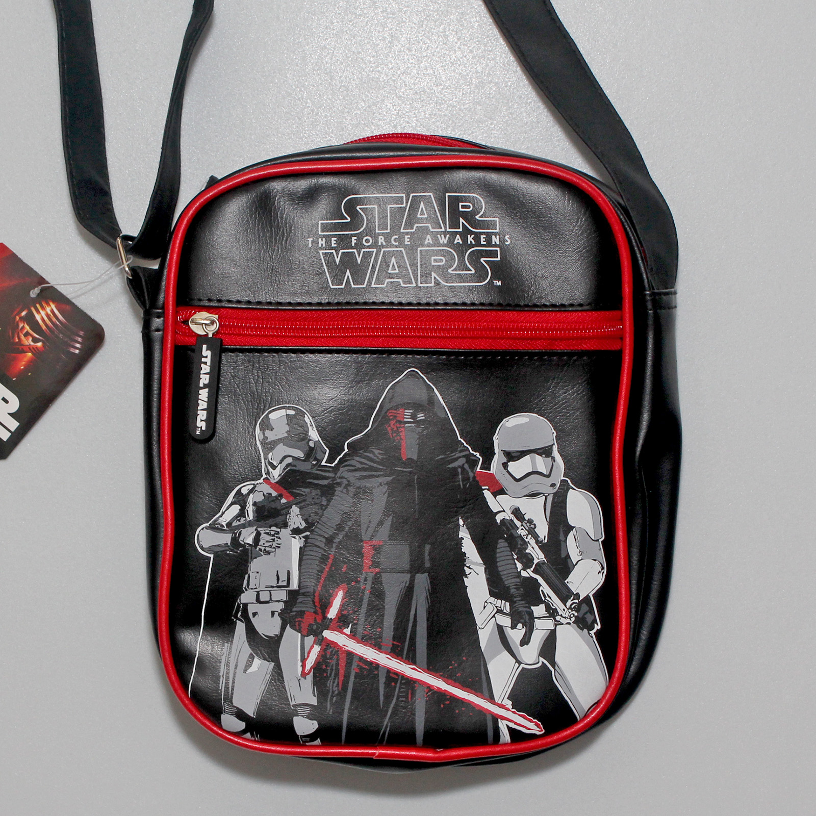 The black vinyl shoulder bag features red piping detail around the edges, and a front print of Kylo Ren, Captain Phasma, First Order Stormtrooper, and The Force Awakens logo (the back of the bag is plain). There is one main zip-up compartment, and one front zip-up pocket – both zips are red plastic, with rubber zipper pulls featuring the Star Wars logo. The bag measures approximately 18cm across, 23cm tall, and 7cm deep. The black shoulder strap is adjustable, with silver-toned hardware – it measures approximately 73cm at it’s shortest adjusted length, and approximately 136cm at it’s longest adjusted length.