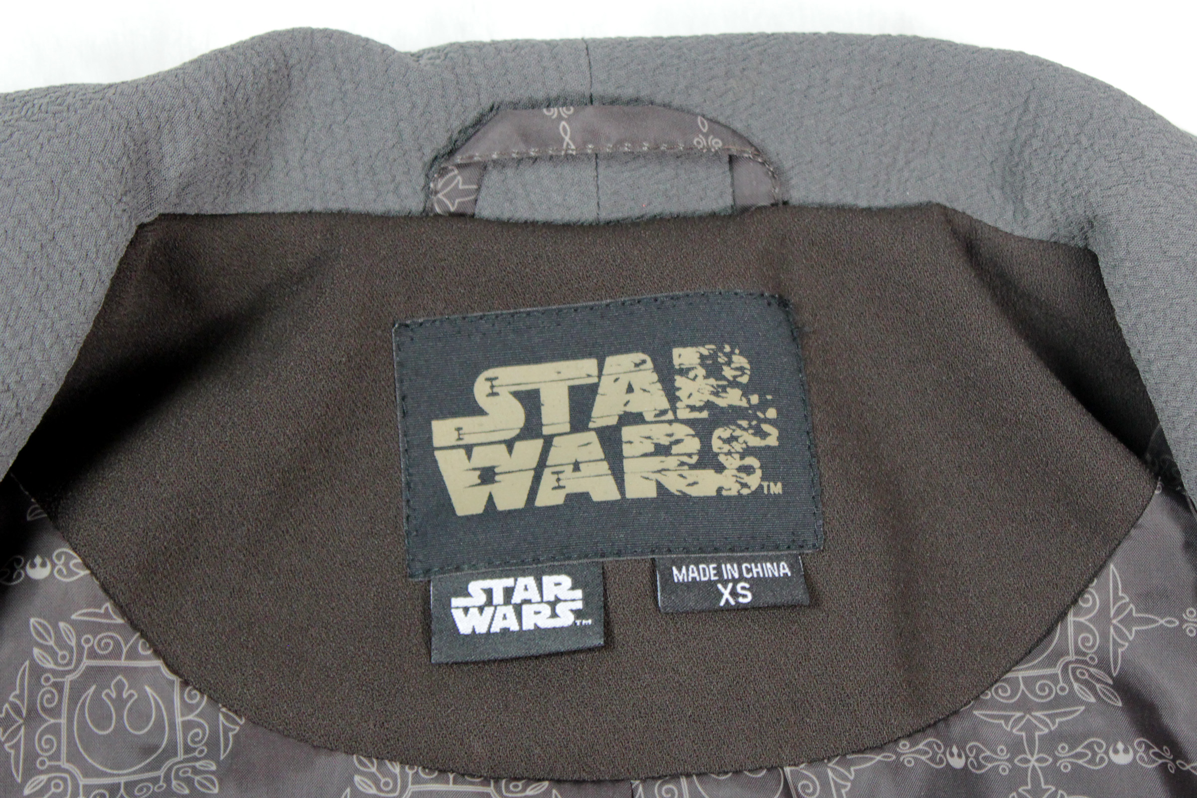 At the inner back neckline, there is a small panel of brown fabric, which features a garment loop for hanging (made from the lining fabric), a printed Star Wars logo tag, an embroidered Star Wars garment tag, and sizing/country of manufacture tag. The care instructions are listed on the garment tag which is sewn into the inner left side seam.