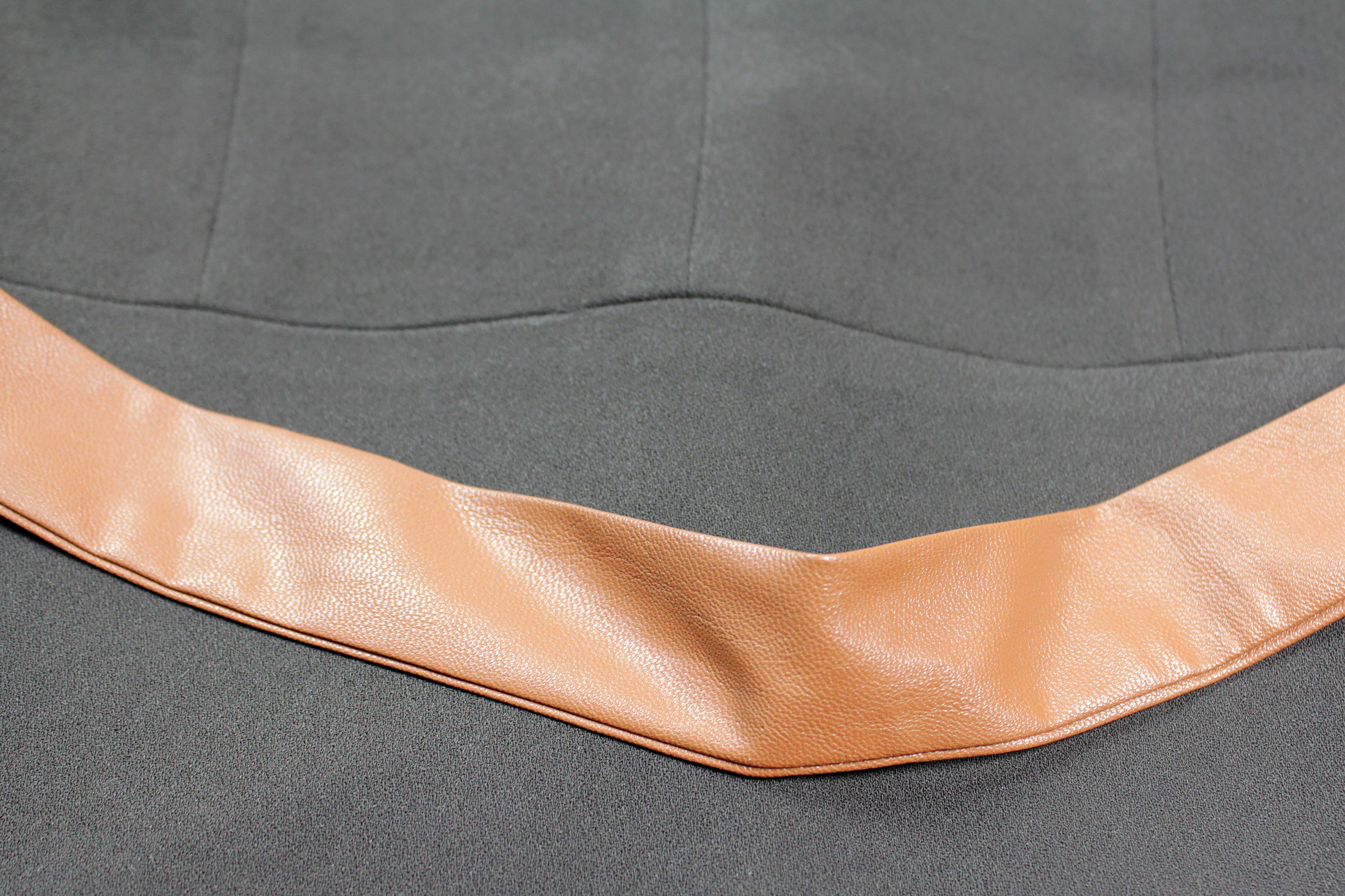 The blazer features a brown belt to tie closed at the front when wearing. This is perhaps one of the more obvious costume inspired elements, due to the colour and material used. The brown belt is made from 2 layers of brown faux leather, seamed together at the edges with no top stitching. The faux leather is soft, so it can be tied in a knot to close the blazer. The ends of the belt are finished in point, which echoes the shape of the front of the blazer.