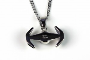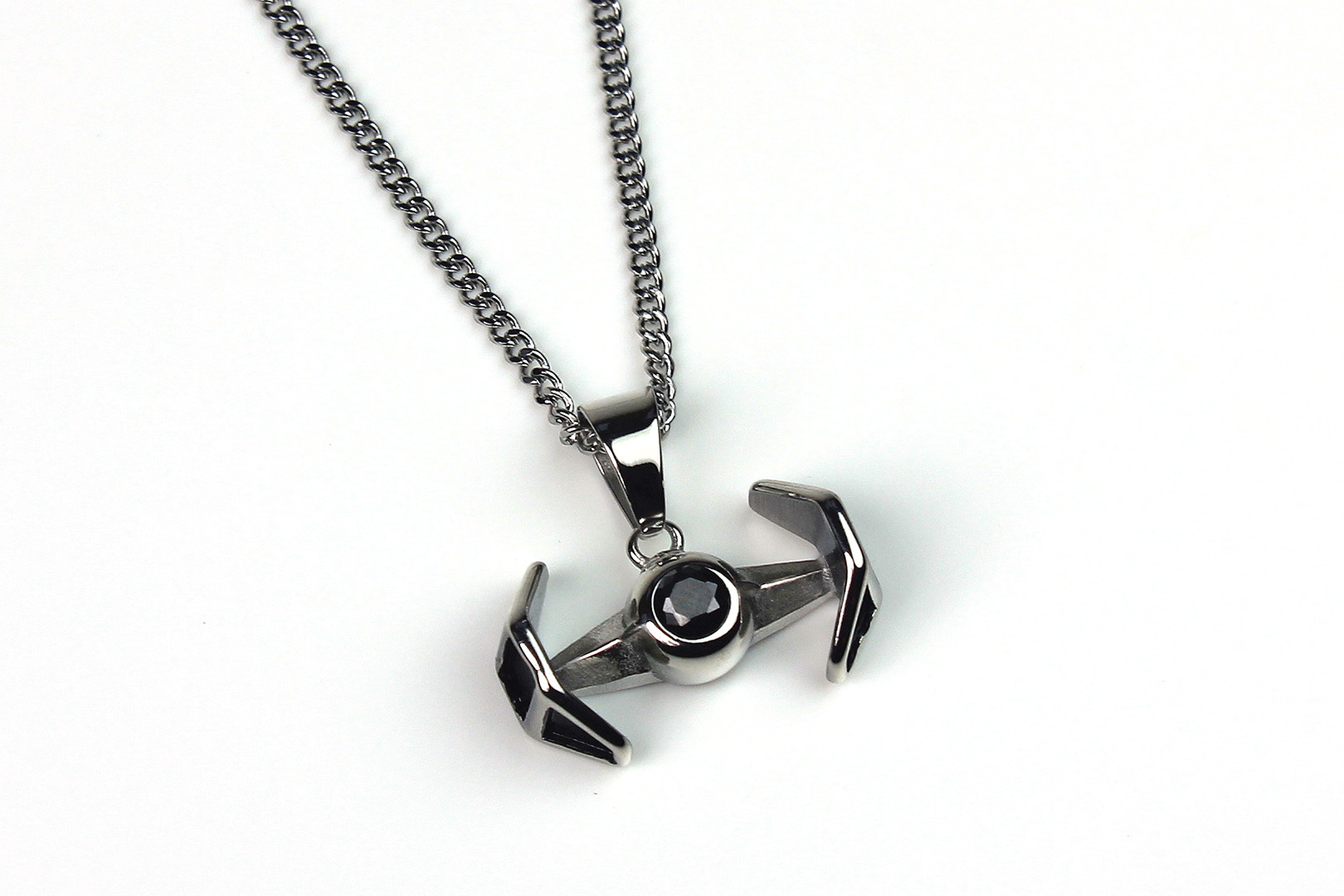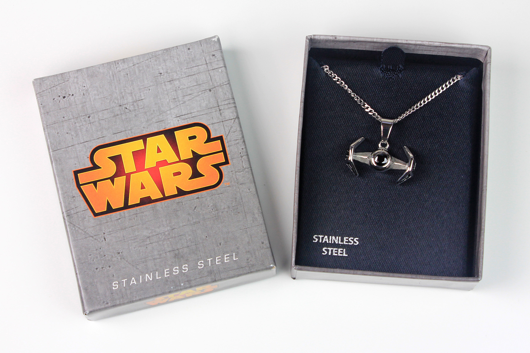 While it’s been hard to narrow down my shopping list from the Body Vibe x Star Wars range of jewelry, one item I knew I needed was the TIE Advanced X1 necklace. Originally available from Thinkgeek for US$29.99, I bought it during a sale a little while ago for US$23.99 – though now it’s discounted even further to US$17.99. Like the other items in the collection, the necklace comes packaged in a branded box with black card insert, the chain length is packaged in a small zip lock bag behind.