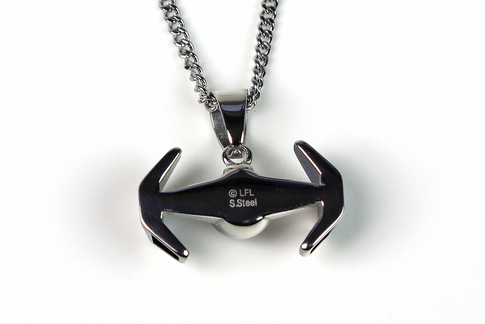 Made from stainless steel, the necklace features a pendant of a TIE Advanced X1. The starship is accented with a black rhinestone in the center, and inset black enamel on the outer wing panels. The TIE fighter itself measures approximately 2.5cm wide and 1.5cm high. The back is flat, so the pendant sits nicely when worn – it is etched with ‘(c) LFL S. Steel’. The adjustable chain measures approximately 41cm long, with a further 5cm for adjustment and closes with a lobster-style clasp. The chain is thinner than the one used on many other of the Body Vibe x Star Wars necklaces (like the Celebration Anaheim exclusive), which suits the small pendant nicely. It’s a great addition to my jewelry collection, I love the added details and rhinestone to give it a little bit of sparkle.