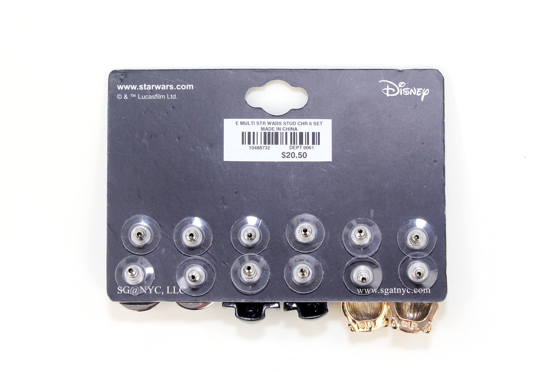 The earring set came packaged on a black cardboard backing card, with branding on the front and back. The set includes six pairs of stud earrings – three sculpted character earring pairs, and three rhinestone earring pairs. Each stud earring has a clear plastic disc backing, which is often used for comfort with larger/heavier earrings. The set is well coordinated, with the rhinestone earrings featuring a complimentary color stone for each of the characters –