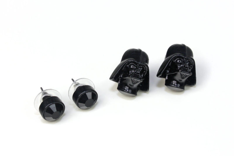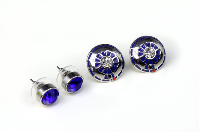 The C-3PO earrings have a shiny gold-tone finish, the Darth Vader earrings have a glossy black finish, while the R2-D2 earrings have a shiny silver-tone finish, with blue enamel details and clear/black/red rhinestone accents. The small red rhinestones on the R2-D2 earrings really catch the light well despite their size – they look illuminated like R2-D2’s light! As I mentioned earlier, I just love this ‘top down’ angle used for the R2-D2 earrings, they look more abstract, and less recognizable to those not familiar with R2-D2.