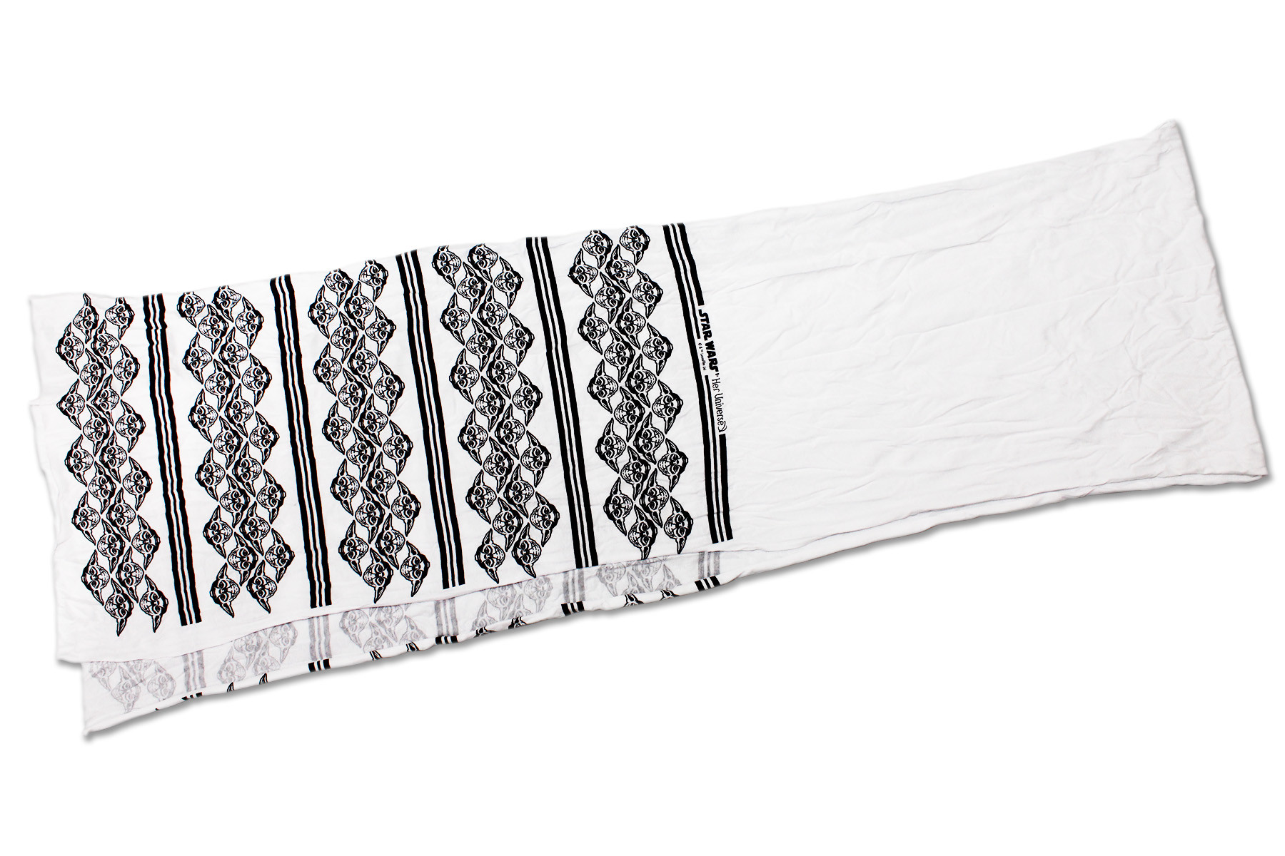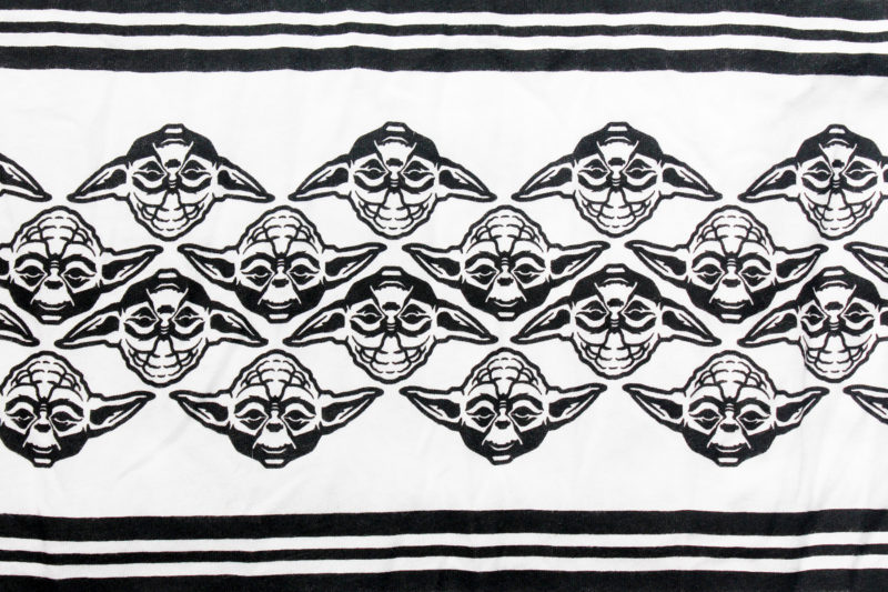 Each end of the scarf features five sections of ‘Yoda head’ pattern printed in black – each section is comprised of four lines of ‘Yoda heads’ in a tessellation style pattern, with black stripes in between each section. The first stripe includes the Her Universe and Star Wars logos, with the standard Lucasfilm copyright text. The pattern is printed onto the fabric, so it will ‘crack’ a little if you stretch the fabric.