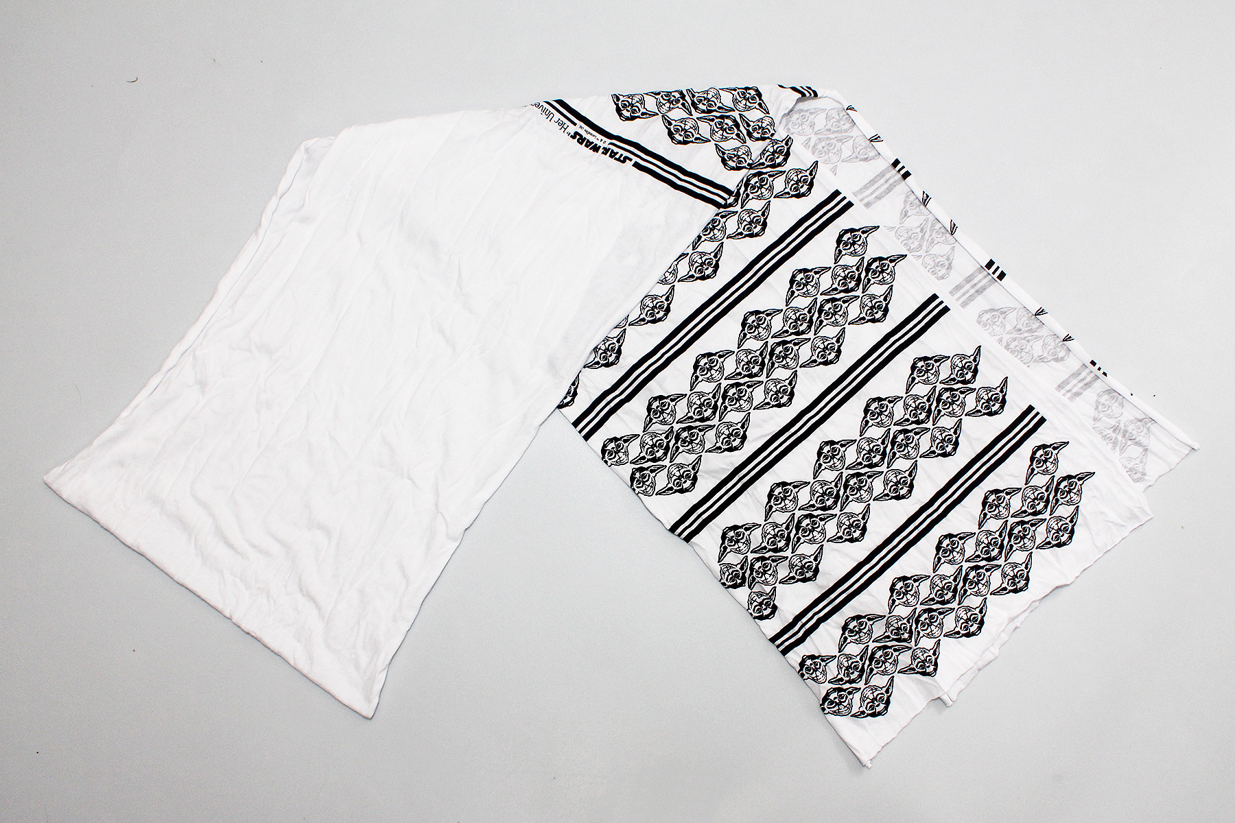 The scarf is literally a cut strip of fabric – there are no hems, no stitching of any kind. For US$25.00, I expected this scarf to at least have hems, so I was really surprised by just how simple it is. This type of knit fabric technically doesn’t need hemming, as it does not fray, but hems would give the scarf a much cleaner, finished look. The direction of the fabric grain causes the edges to roll inwards, which does give a slight hem effect, but this also reduces the apparent size/width of the scarf.