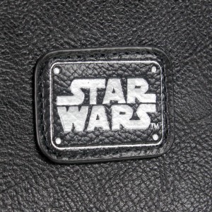 The handbag is made from a black faux leather, with a lovely leather-like textured finish. The bag has a full-length zip across the top, handles, and a removable/adjustable shoulder strap. The front of the bag features a two-layer shiny black vinyl appliqué of Darth Vader’s helmet. Of course, the appliqué is a huge point of appeal – I love the contrast of the shiny vinyl with the more natural leather-like finish of the bag. It can be hard for ‘black-on-black’ detail to show up well – this bag keeps the total black colour scheme without losing any detail. The black top stitching on the two layers of the appliqué help accentuate the detail lines – it just looks fantastic in person with light reflecting off the vinyl. The classic Loungefly Star Wars ‘plaque’ on the back is made from the faux leather, rather than the enamelled metal plaque used on other Loungefly handbags.