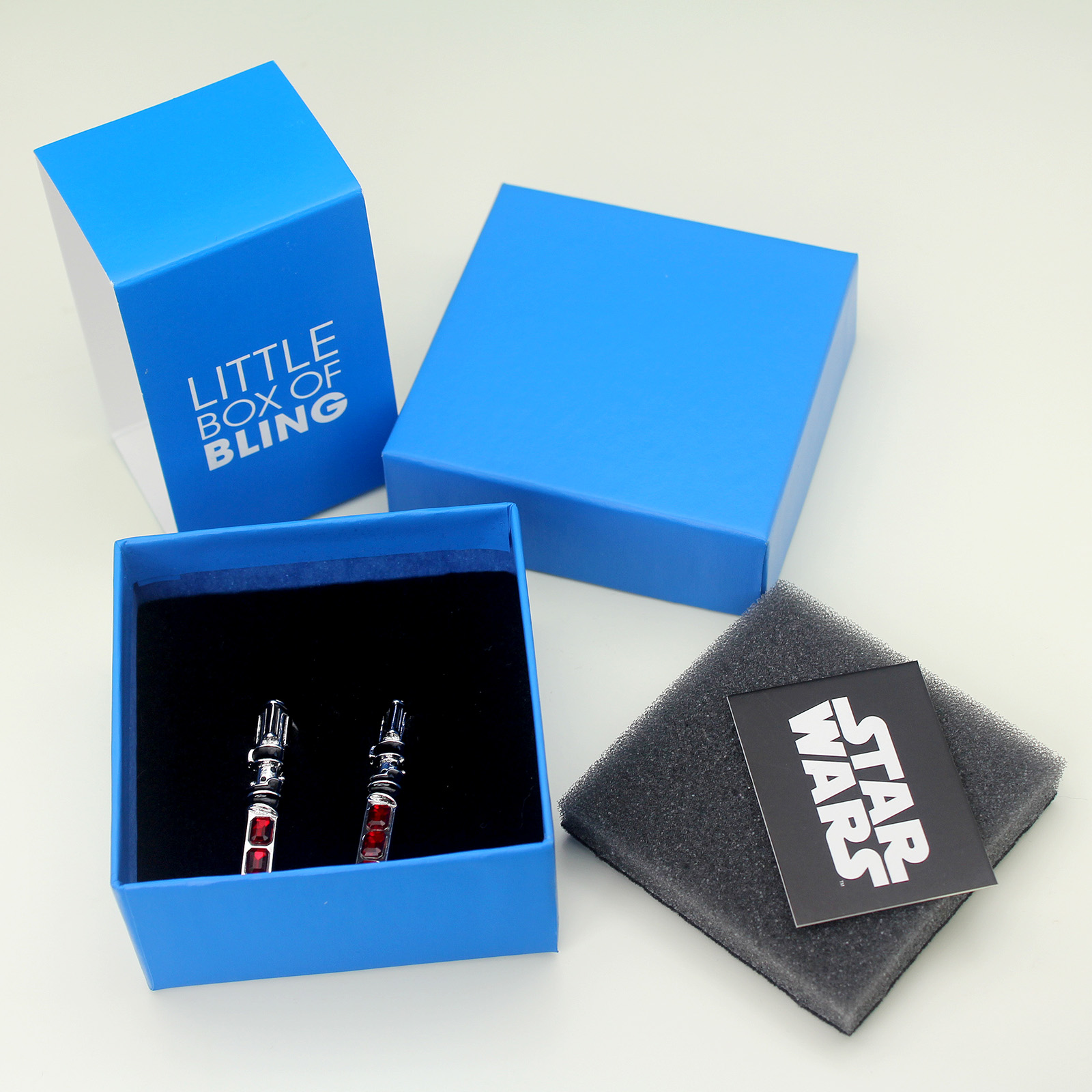In November last year, HSN released a collection of ‘bling’ Star Wars jewelry. As HSN does not ship outside the US, or accept international credit cards, I was really frustrated to see such a fantastic collection released that international fans couldn’t purchase. An amazing friend in the US helped me purchase a few of my favourite items from the range, which I was able to pick up while visiting the US for the Run Disney Star Wars event last month (yay, saving on international postage). I am so excited to finally see these items in person, and of course photograph them for review. I was able to buy eight items from the range – today’s review features the ‘bling’ Darth Vader lightsaber stud earrings and matching necklace (sold separately).