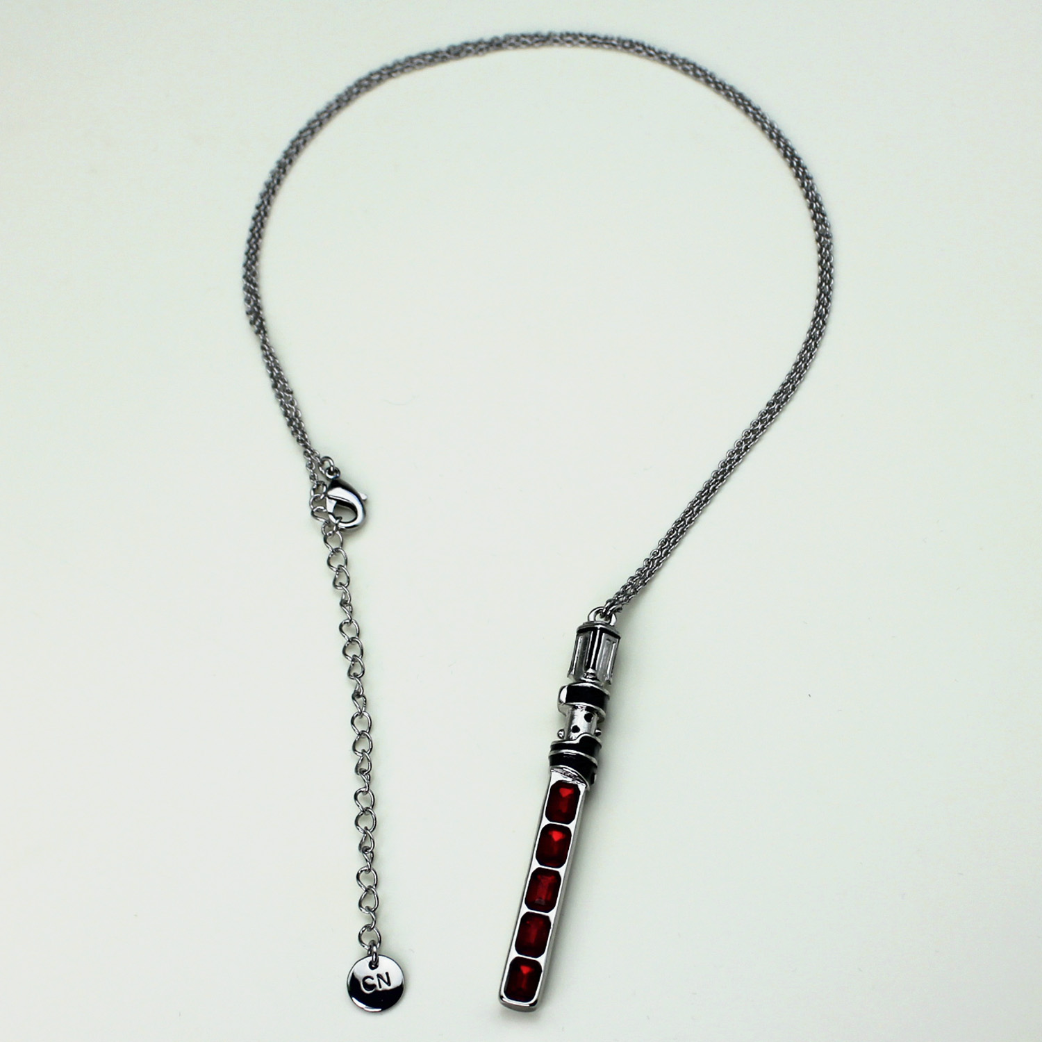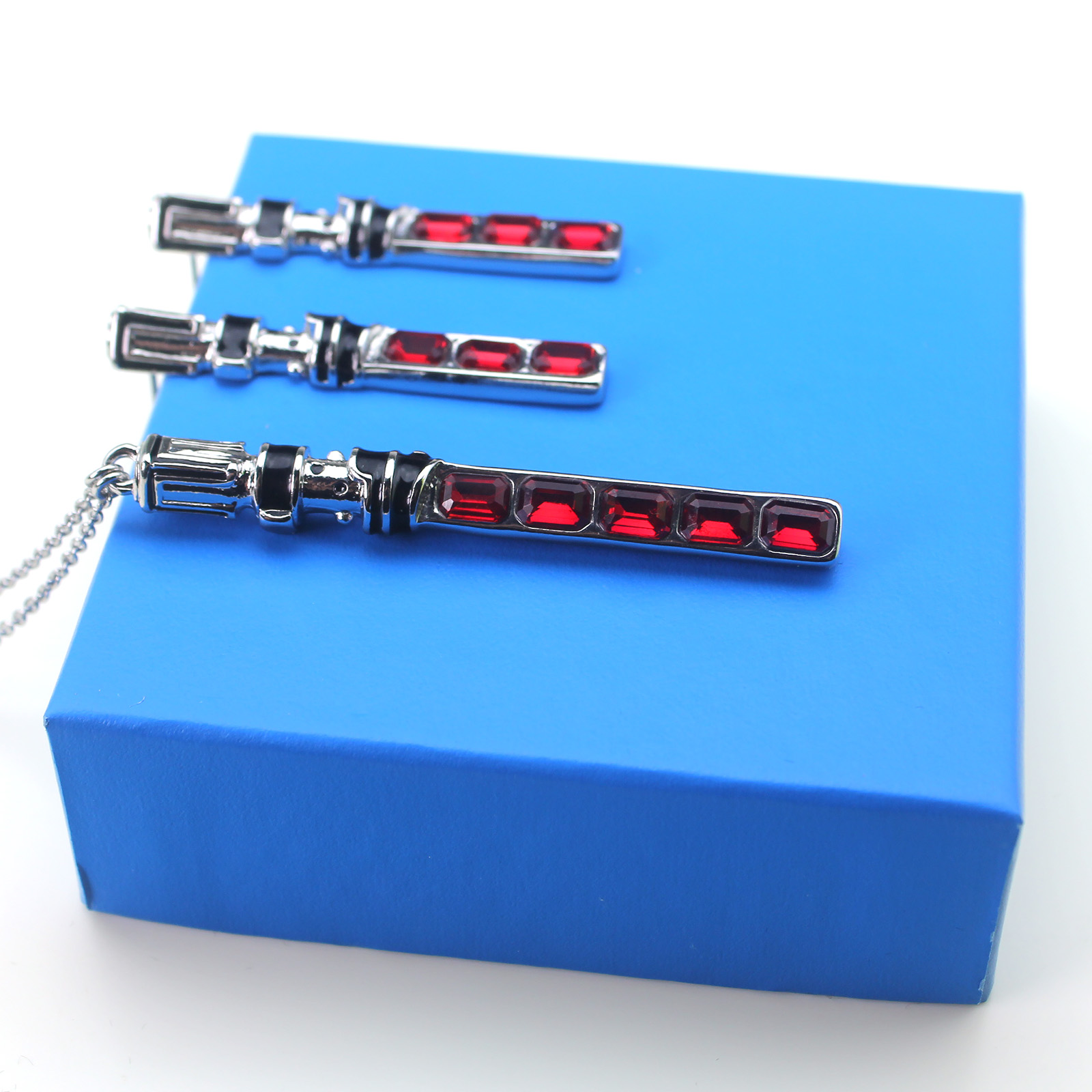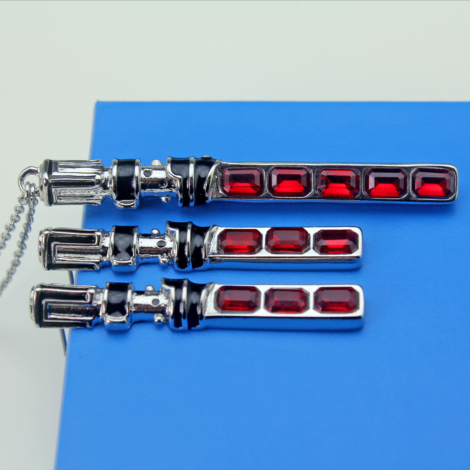 I was very interested to compare the necklace and earrings together, as some coordinating jewelry sets use the same sculpt – these are almost the same, with two small differences. The sculpt of the hilt is the same size for both, which I was not expecting (I thought the earrings would be smaller). The red rhinestones are also the same size for both, but the pendant has five, compared to three used for each earring. Also, the earrings are flat-backed, while the necklace pendant is completely ’round’ like a lightsaber.