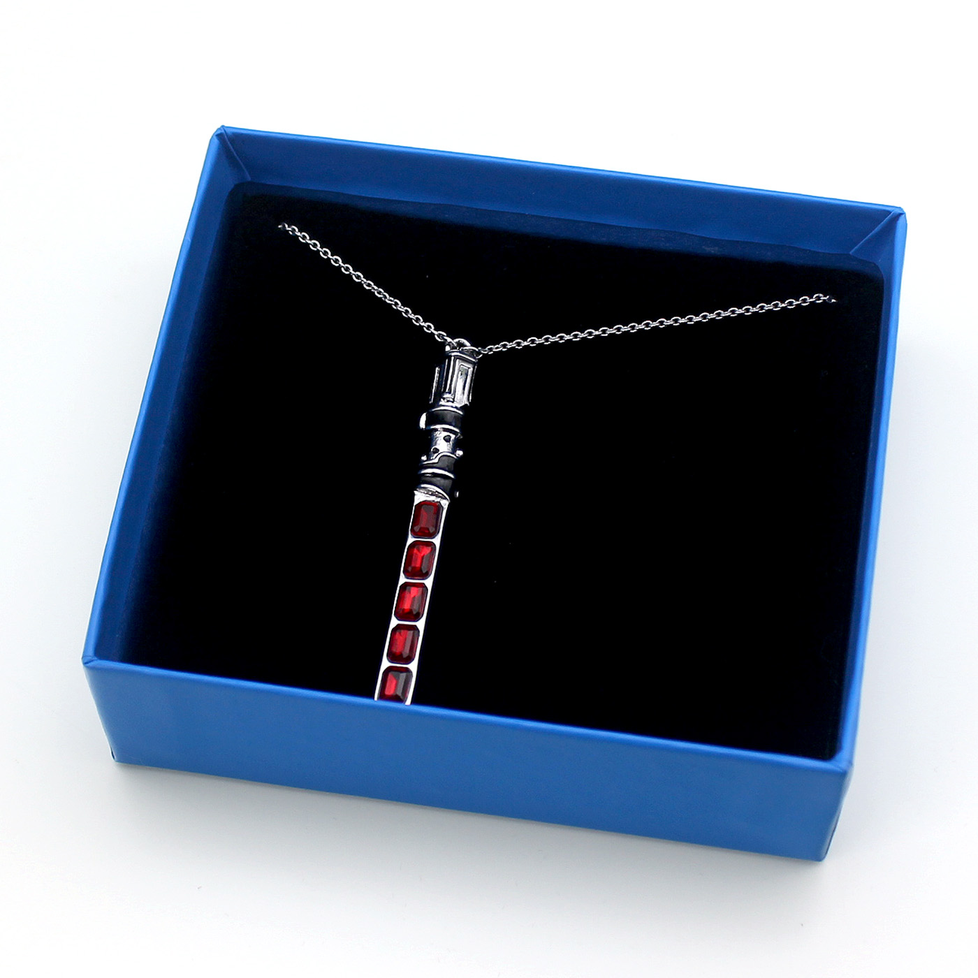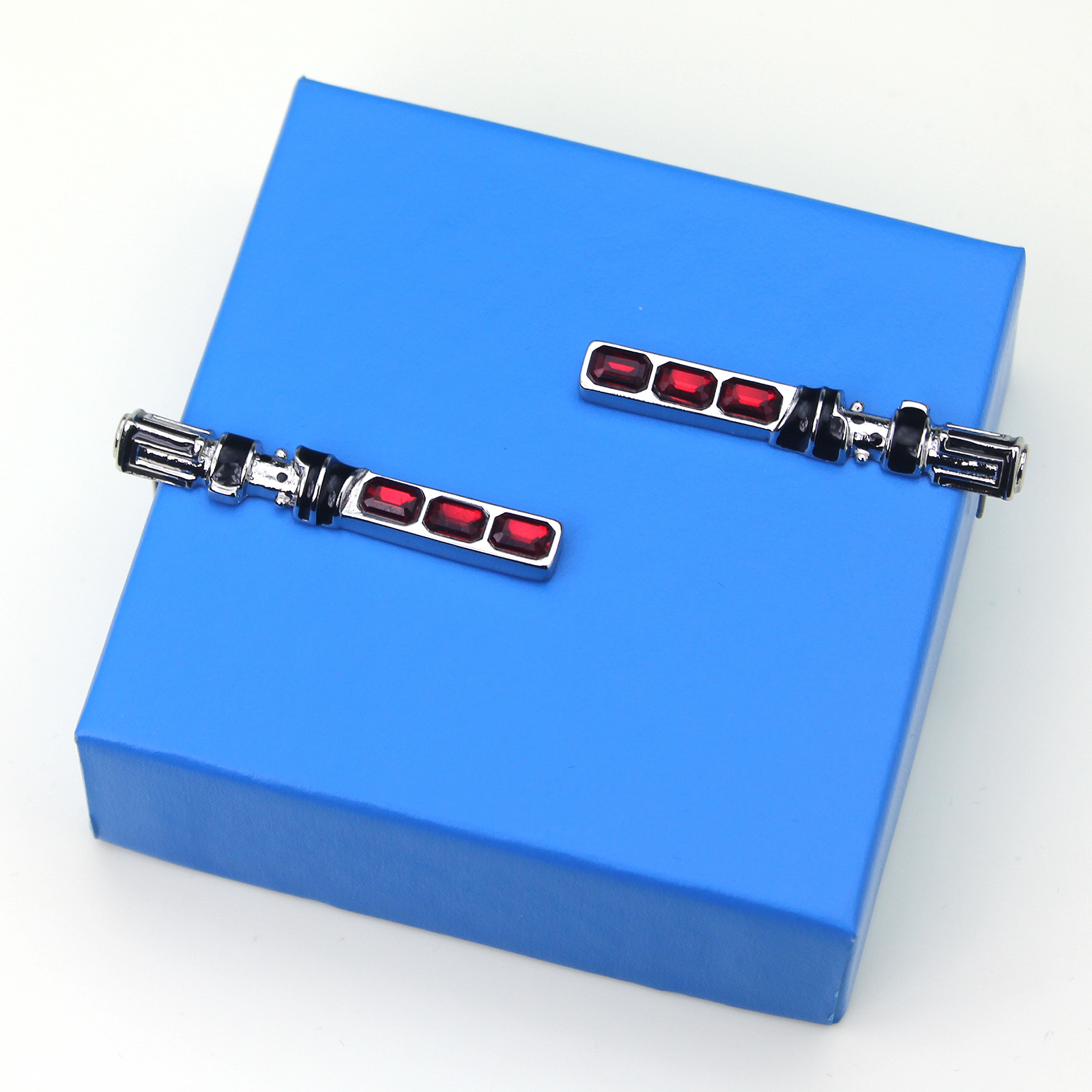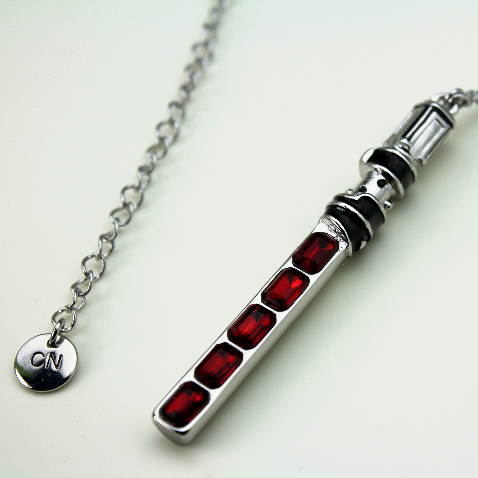 I was very interested to compare the necklace and earrings together, as some coordinating jewelry sets use the same sculpt – these are almost the same, with two small differences. The sculpt of the hilt is the same size for both, which I was not expecting (I thought the earrings would be smaller). The red rhinestones are also the same size for both, but the pendant has five, compared to three used for each earring. Also, the earrings are flat-backed, while the necklace pendant is completely ’round’ like a lightsaber.