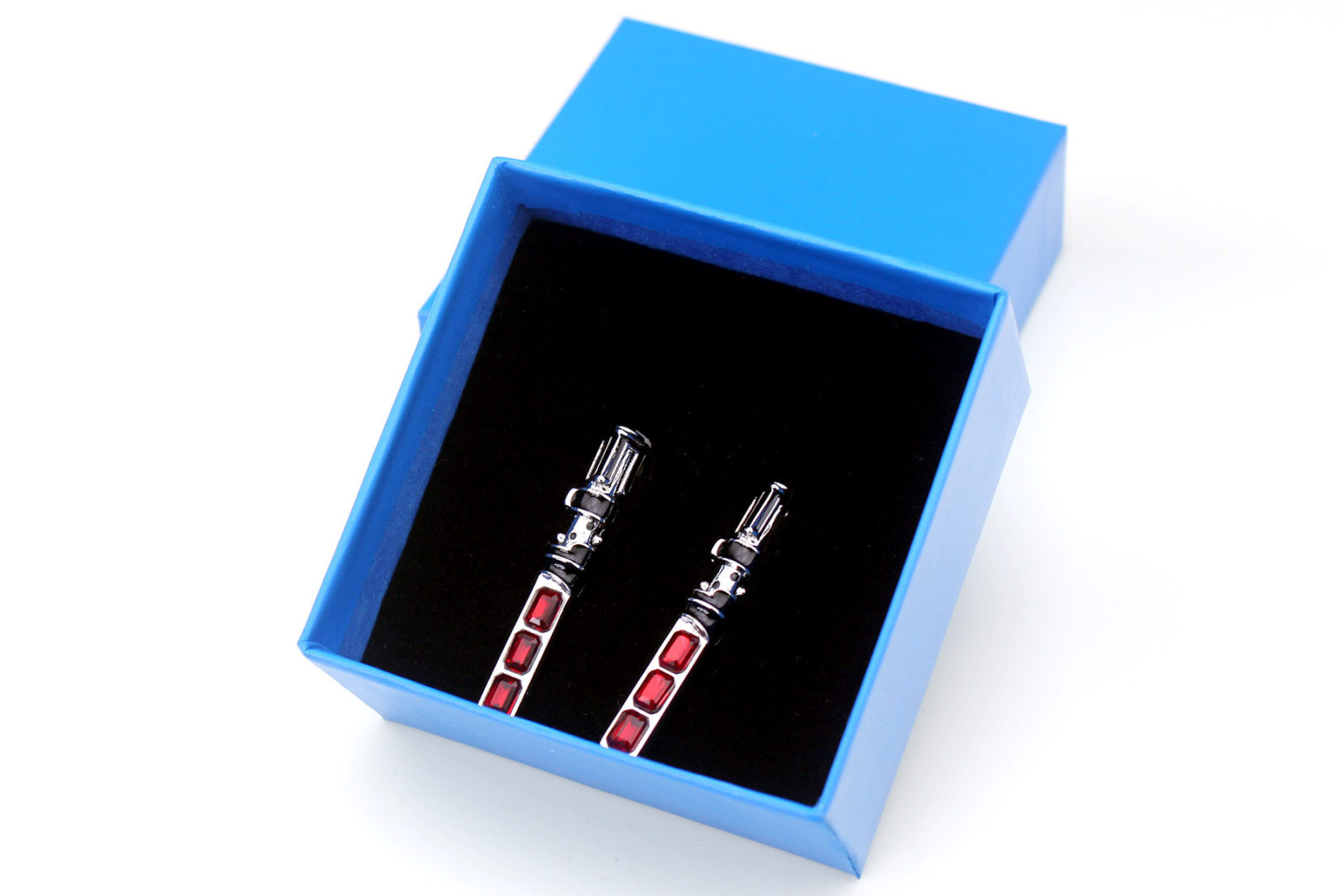 These earrings are available in two design choices – red with Darth Vader’s lightsaber, or green with Luke Skywalker’s ROTJ lightsaber. As I already have two jedi-themed lightsaber earring sets (in blue, from Bioworld and Body Vibe), I decided I needed some sith representation in my jewelry collection. The Jedi Order symbol is used quite frequently in modern Star Wars jewelry – Sith symbols aren’t as widely known or used, so the classic Empire symbol is used for most ‘bad guy’ themes (even though for sith, it only applies to Darth Vader and Darth Sidious).Of course I wish I could have bought both sets, as the green stones look lovely (and I’m always a big fan of jedi themed fashion), but my sith themed apparel could do with some fantastic coordinating jewelry. While the hilt is specifically Darth Vader’s, I feel the red colour is strong enough to represent sith lightsabers in general. Both colour choices are still available at HSN – priced at US$29.95 per pair.