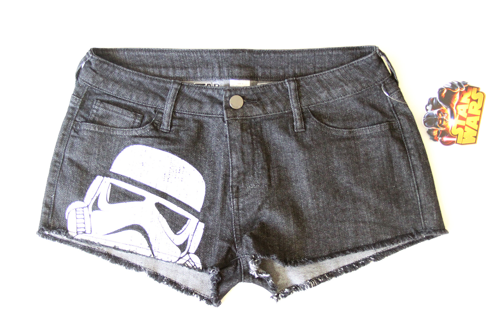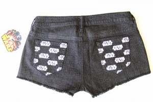 We Love Fine have really been expanding their variety of Star Wars apparel for women – a great example is this pair of denim shorts. They feature a stormtrooper helmet print on the front, and repeating Star Wars logo print on the back pockets. Available in sizes s to xl – I bought mine in size small. They measure approximately 38cm across the waist and 27cm across the thigh. It appears that the front stormtrooper print is the same for all sizes, so it’s little more cut off on these than on larger sizes, but it’s still recognizable. The black denim is 99% cotton, 1% spandex so they have a little stretch. The front print has a weathered effect, coordinating well with the cut-off denim edges. The raw edges have stitching close to the edge, so the denim won’t fray beyond the intended length. I paid US$38, a great buy – it’s not every day you find Star Wars shorts for women, these were a must-have for me.