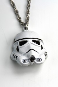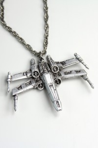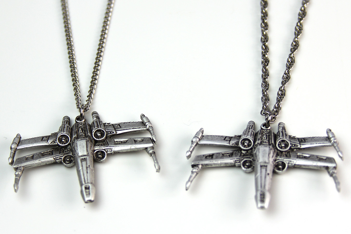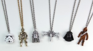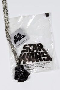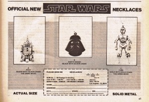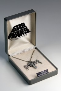The necklaces feature 6 different characters – C-3PO, R2-D2, Darth Vader, Stormtrooper, Chewbacca and X-Wing. According to the SW Collectors Archive, each pendant was made in two sizes, small and large – I believe mine are the larger versions. They came each in a plastic bag, with a little silver cardboard tag. I have noticed that these pendants come with two different chain styles, it may be because some came carded and some bagged? I am not certain, I haven’t bought one carded as it seems a shame to open a carded vintage item for use when the bagged versions are easier to find. I prefer the larger ‘twisted’ style chain, and have collected pendants with it – you can see a comparison of the two styles between my two X-Wing necklaces. As well as bagged and carded, I have found some were available with boxes, like my ‘thin chain’ version X-Wing necklace. I’m not sure if that was a separate item purchased from stores (to give the necklace as a gift etc.) or if that’s how some were sold.