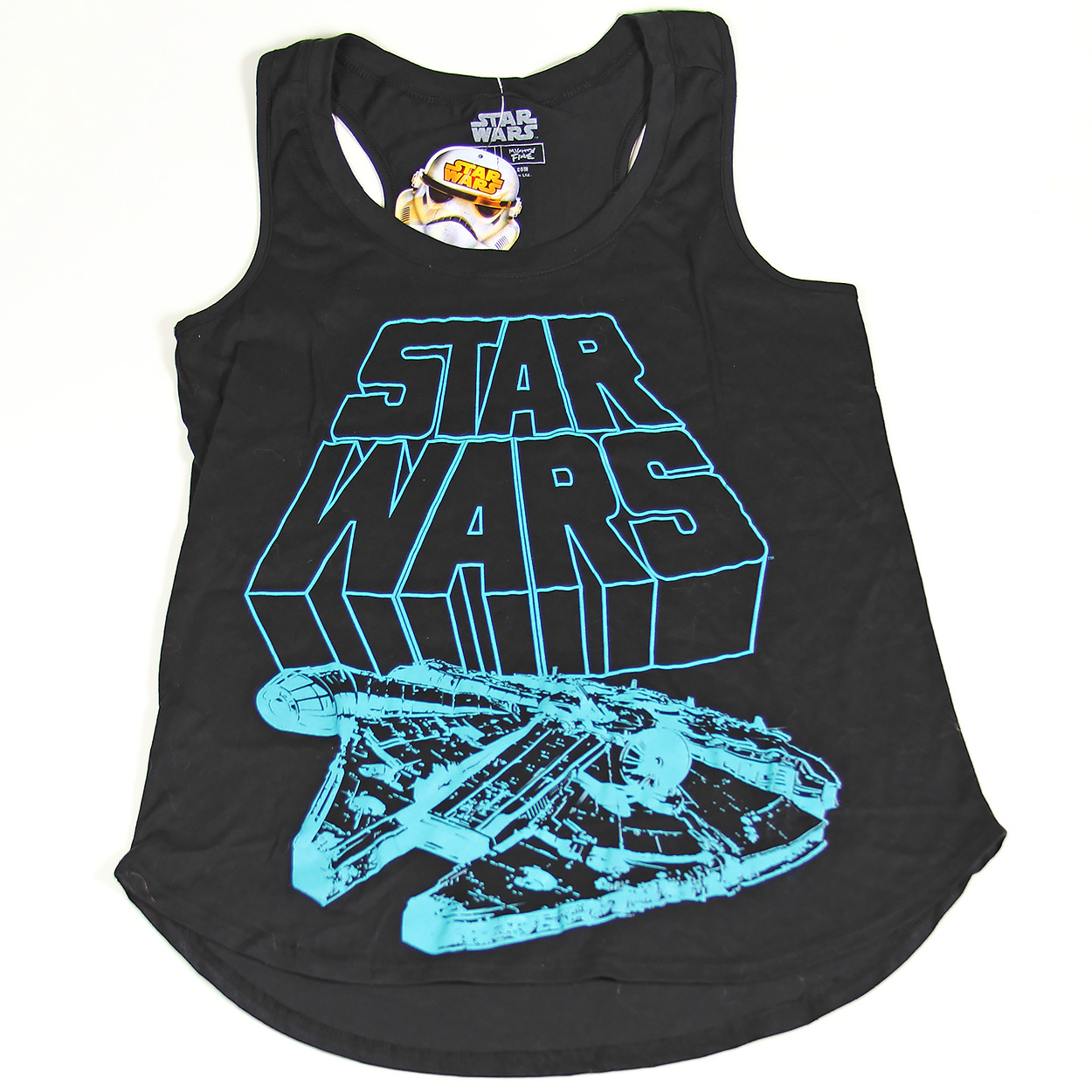 The Millennium Falcon tank top by Mighty Fine is a looser cut style, being slightly wider through the chest than Her Universe top though both are size small. It is also made from a softer and thinner cotton, adding to the casual style. The print is nice and vibrant against the black, with the vintage style Star Wars logo above the Millennium Falcon. It has a longer rounded hem, rather than flat across, which is a nice cut for this style. It’s retail price was US$24.99.