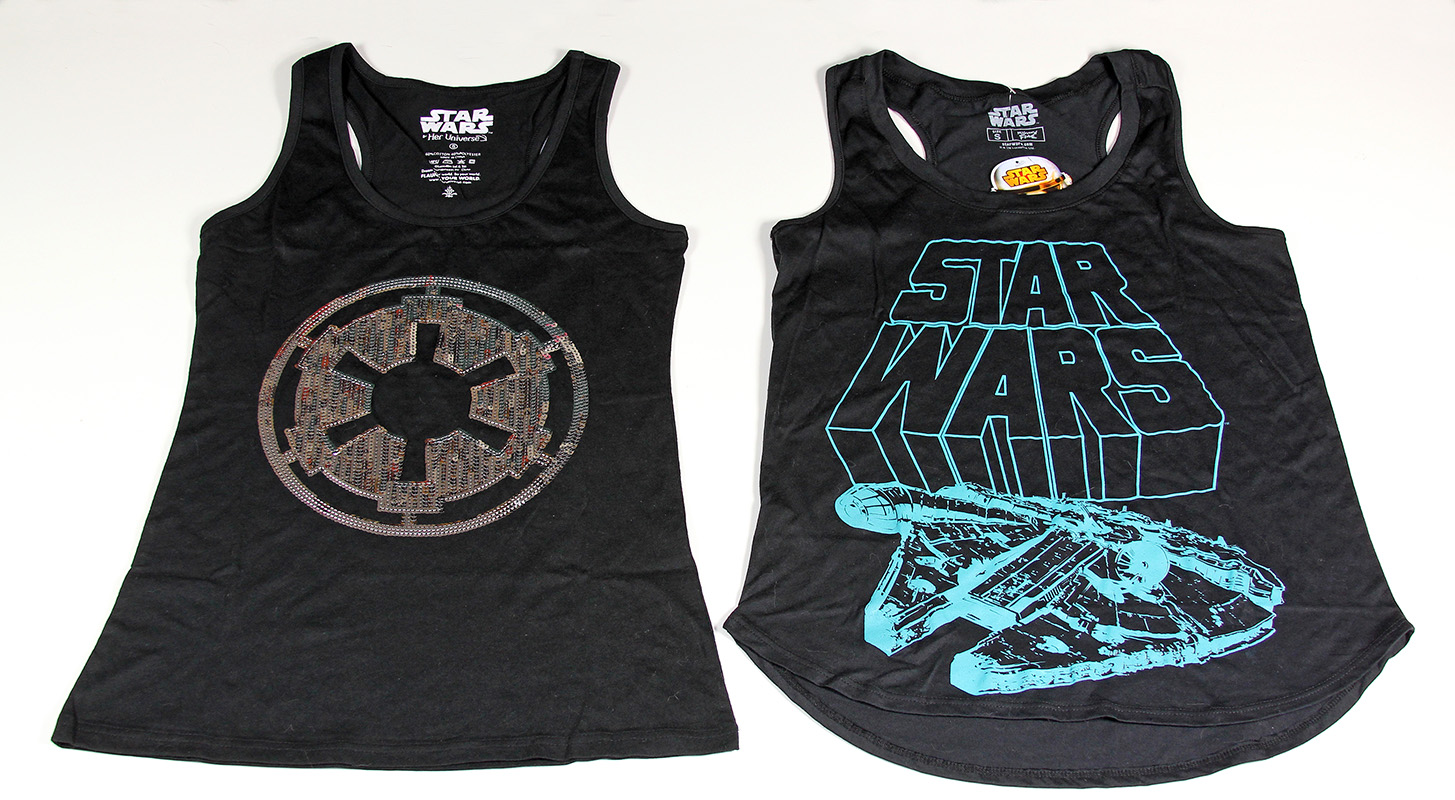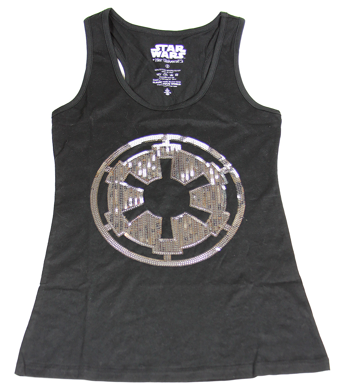 Thinkgeek recently had a promotion allowing customers to ‘cash out’ rewards points for a US$20 voucher, so I jumped at the chance to use my points towards some new Star Wars fashion. I picked up two items – a black Millennium Falcon tank top by Mighty Fine, and the sequin Imperial cog tank top made by Her Universe.
