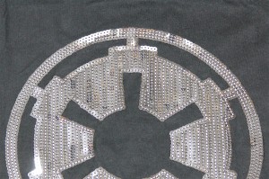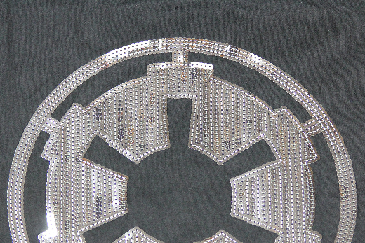 I loved the Imperial cog tank top the moment Her Universe previewed it at Disney’s Star Wars Weekends. As Her Universe doesn’t ship internationally (well, to United States, Canada and the UK only), I can only purchase their items by way of a mail re-directing service – which I have, but it’s always nice to not have to pay extra. So I was of course excited to see it available on Thinkgeek.com, which does ship directly to NZ. It’s retail price was US$29.99, very reasonable for a sequinned top. The Imperial cog design is created with flat silver sequins, which are smaller than standard sequins, so the design is very tidy and shiny.