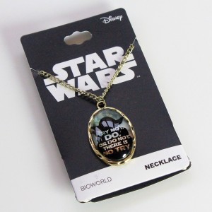 I recently picked up a few Star Wars accessories from Hot Topic, including this Yoda cameo necklace. Made by Bioworld, the necklace features an image of Dagobah, with the silhouette of Yoda in front with his classic jedi training advice ‘Try Not, Do, or do not. There is no try’. The pendant has a clear dome, which I’m not sure if it’s glass or plastic. The pendant setting is sculpted like wood, with little knot holes which remind me of Yoda’s cane. The pendant is hung from an adjustable yellow-gold toned chain, which closes with a standard lobster-style clasp. The chain measures approximately 47.5cm long, with a further 8cm for adjusting. The pendant itself measures approximately 3.3cm high and 2.3cm wide, with ‘(c) LFL’ stamped in the back. It retails for US$8.50, but I paid US$5.92 during a sale at Hot Topic – it is currently still available at the time of writing. As I have a fondness for jedi-themed items, this was a must have for me. Despite being so well known, Yoda isn’t often used for accessories (compared to Darth Vader or R2-D2). I think it’s a fantastic necklace and I’m very happy to have it for my collection.