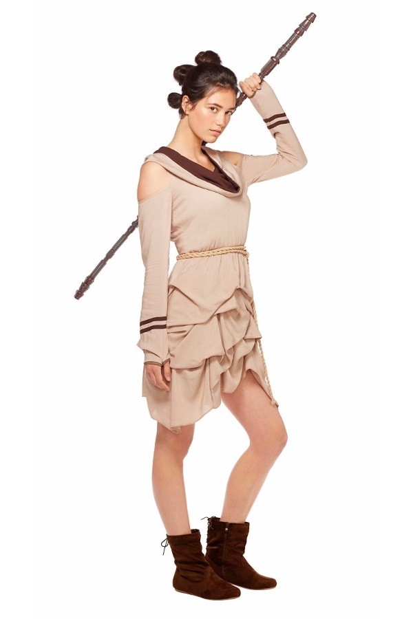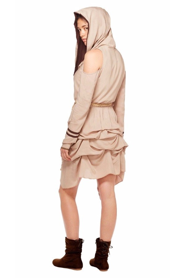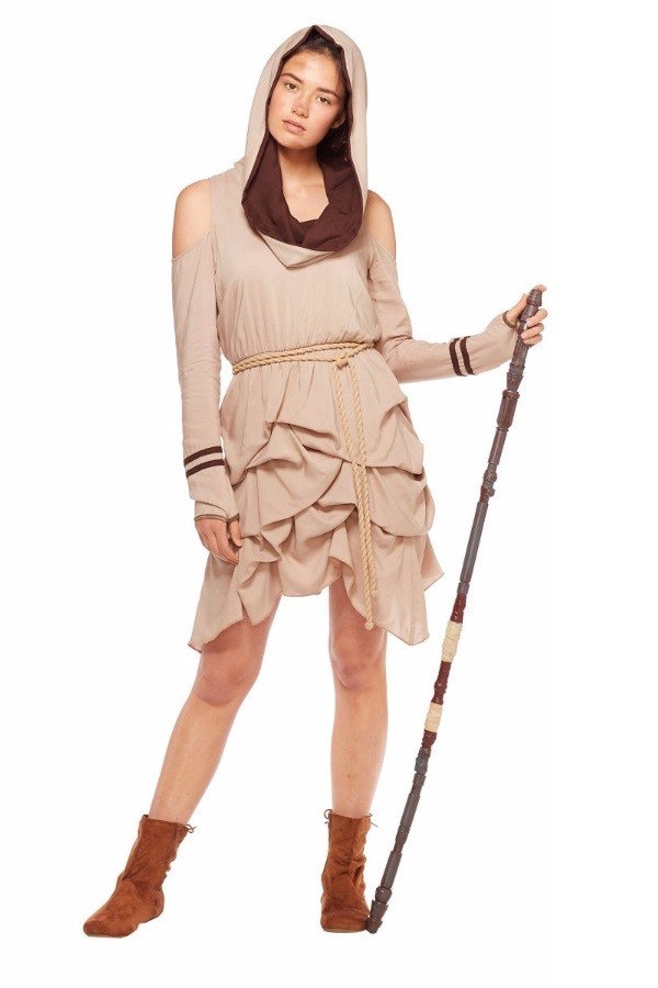 Spirit Halloween has a Rey inspired dress available. The light brown dress features a hood with dark brown lining, ‘cold shoulder style sleeves and a gathered skirt. The ‘everyday cosplay’ style references Rey’s costume, but the design is different enough to make this a very subtle Star Wars inspired look for everyday wear.