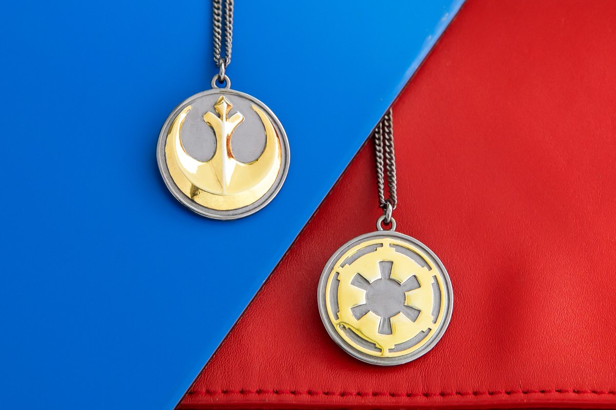 Celebrate 50 years of Lucasfilm with these new necklaces from RockLove. Choose from the Rebel Alliance symbol or the Galactic Empire symbol, accented with yellow gold. Each necklace is a limited edition item, with only 300 units of each design.