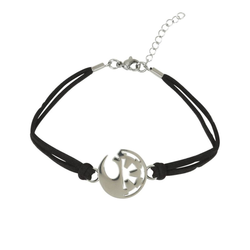 Hot Topic has a new Rogue One bracelet available. The black cord bracelet features a central pendant, which features the left half of the Rebel Alliance symbol, and the right half of the Galactic Empire symbol, joined as one. The bracelet has a length of silver-tone adjustment chain, and closes with a lobster-style clasp. This is one of the first pieces of Rogue One jewelry I’ve seen – although it does work for the original trilogy era in general.