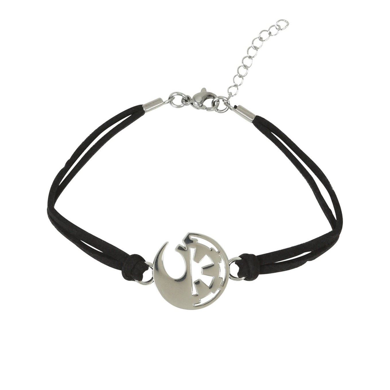 Celebrate the newest Star Wars story with this bracelet from Star Wars Rogue One. The black cord bracelet has a silver tone half Empire symbol, half Rebellion symbol charm.