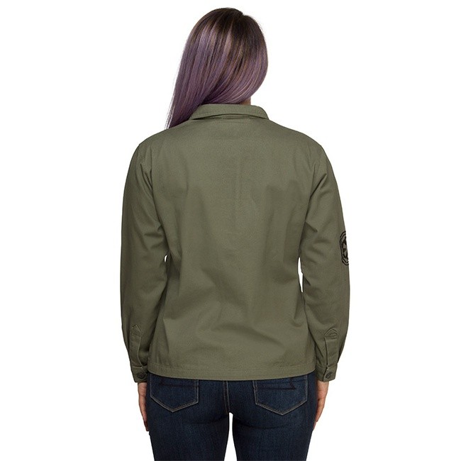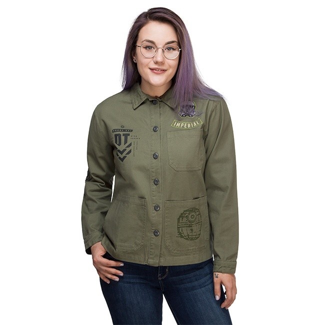 This women’s Rogue One twill jacket is now available at ThinkGeek. The 100% cotton olive twill jacket features Imperial themed printed and embroidered details, including the Death Star, Deathtrooper helmet, and Imperial ‘cog’ symbol.