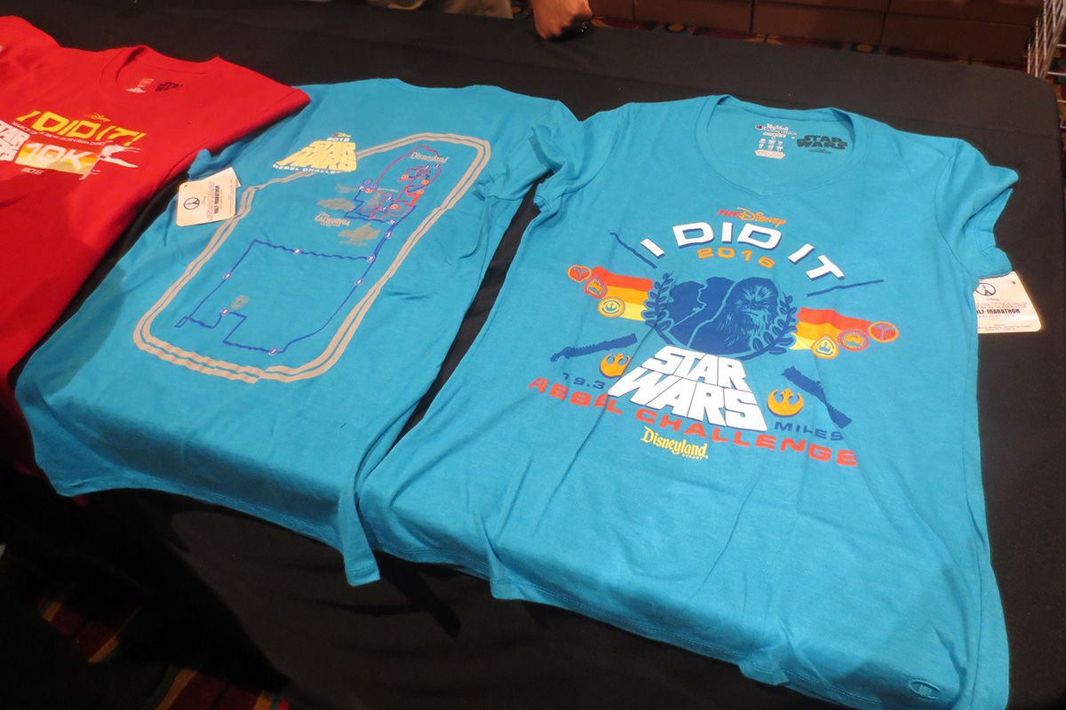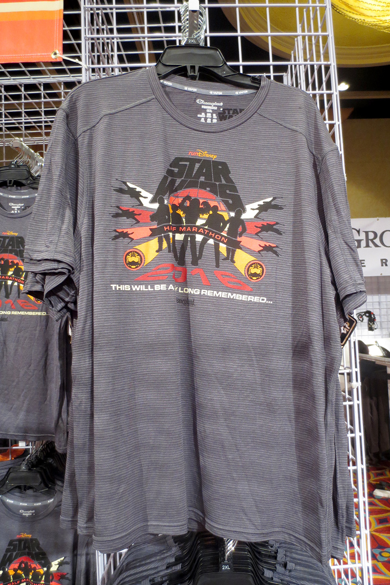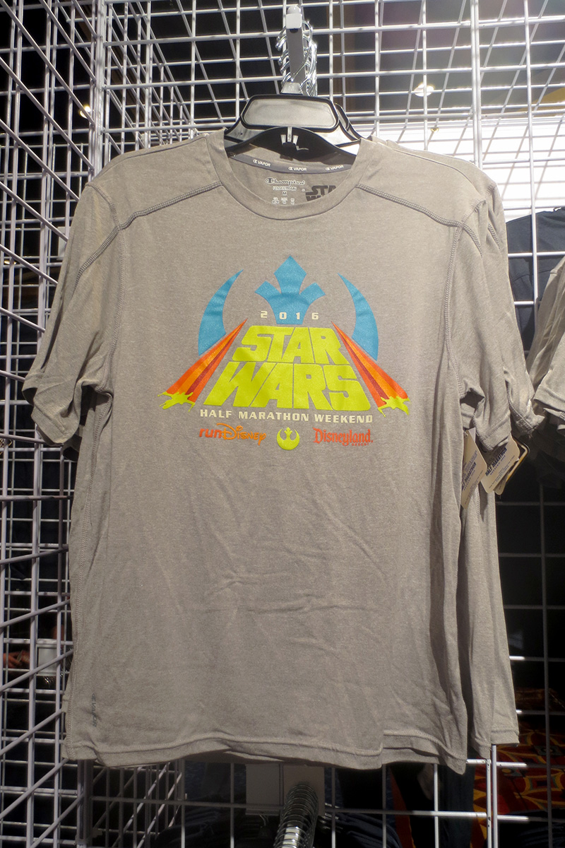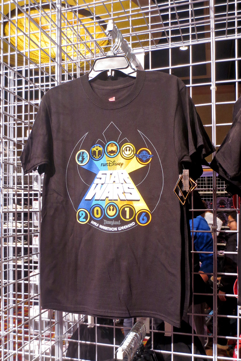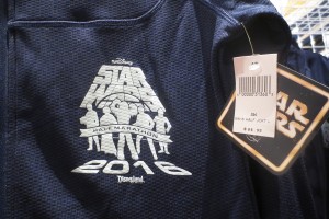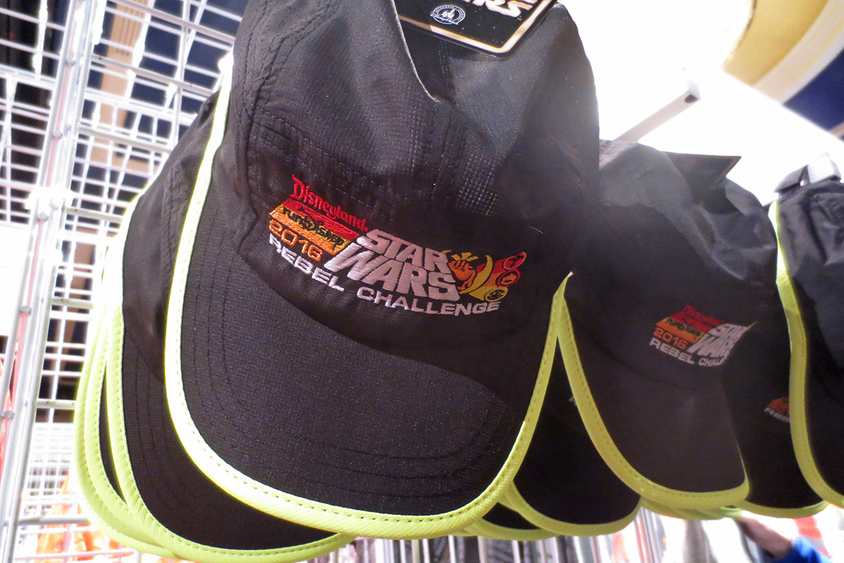 The 2016 Run Disney Star Wars Half Marathon Weekend at Disneyland started with an expo on Thursday 14th January, with a great collection of event merchandise available. The range included tank tops, t-shirts, long sleeve shirts, jackets, pants, headbands, hats, and a necklace (alongside other merchandise like collectible pins and mugs). Designs included general event designs, and also specific designs commemorating the Half Marathon and the Rebel Challenge. I very much prefer this year’s designs over the apparel available for last year’s event – personally, I felt both the garment colours and print designs were better for this year.