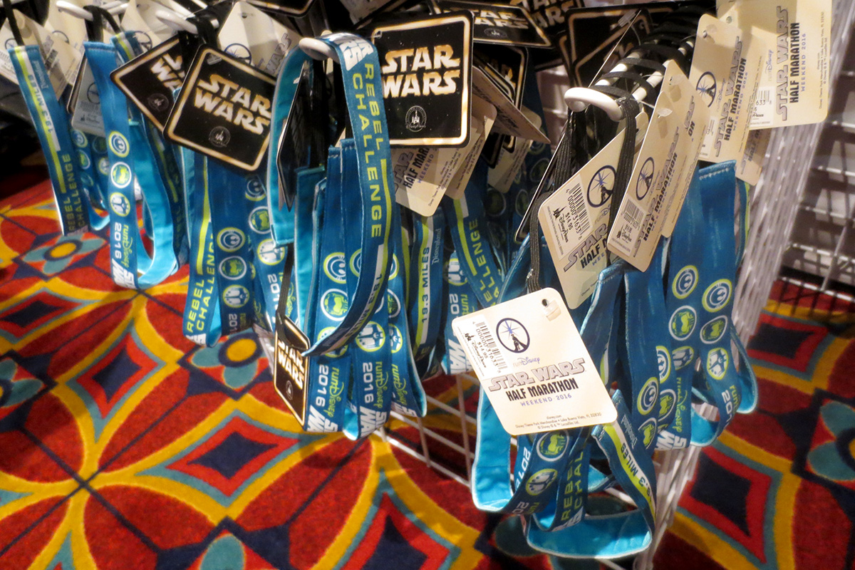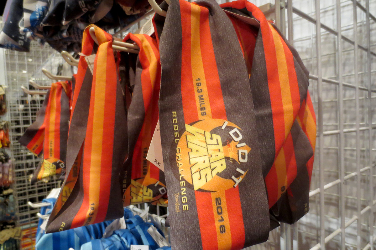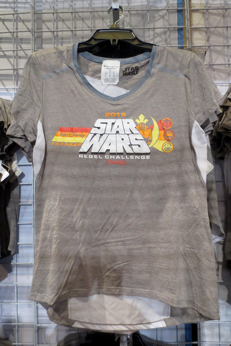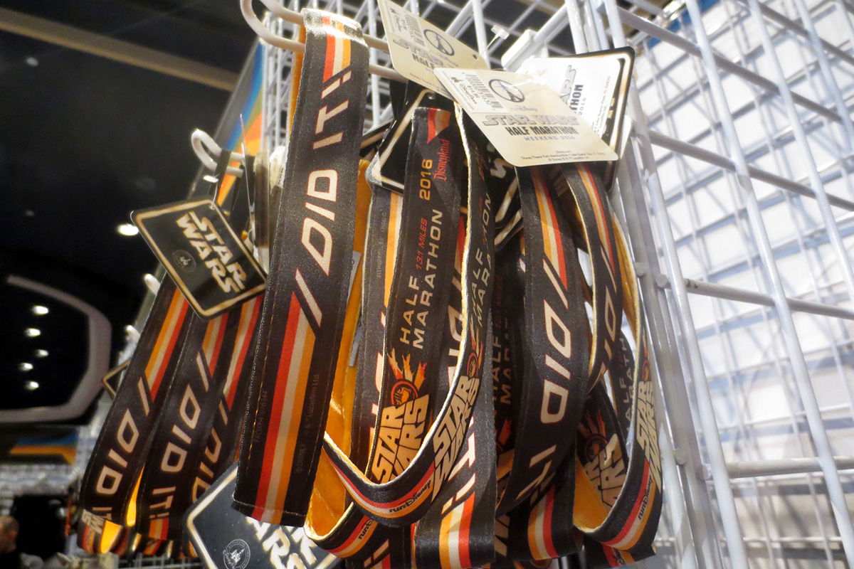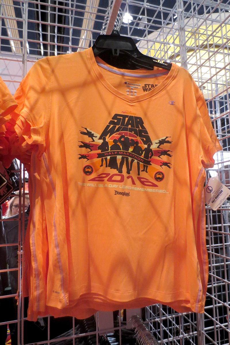 The 2016 Run Disney Star Wars Half Marathon Weekend at Disneyland started with an expo on Thursday 14th January, with a great collection of event merchandise available. The range included tank tops, t-shirts, long sleeve shirts, jackets, pants, headbands, hats, and a necklace (alongside other merchandise like collectible pins and mugs). Designs included general event designs, and also specific designs commemorating the Half Marathon and the Rebel Challenge. I very much prefer this year’s designs over the apparel available for last year’s event – personally, I felt both the garment colours and print designs were better for this year.