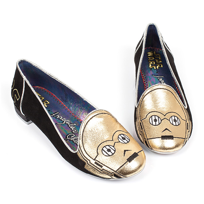 Thinkgeek has four styles from the Irregular Choice x Star Wars women’s footwear collection available to order – C-3PO flats (US$167.99), Darth Vader flats (US$167.99), The Dark Side flats (US$167.99) and Skywalker heels (US$322.99). Each style is available in women’s US shoe sizes 7, 7.5, 8, 8.5, 9 and 9.5 – which is not the full size range available directly from Irregular Choice (their UK sizing converts to a range of US 5.5 to 11.5) Some of Thinkgeek’s website pages show the items as out of stock – as the stock is due in 3 to 5 days (each style is limited to 3 per customer). Thinkgeek can ship internationally, which is great.