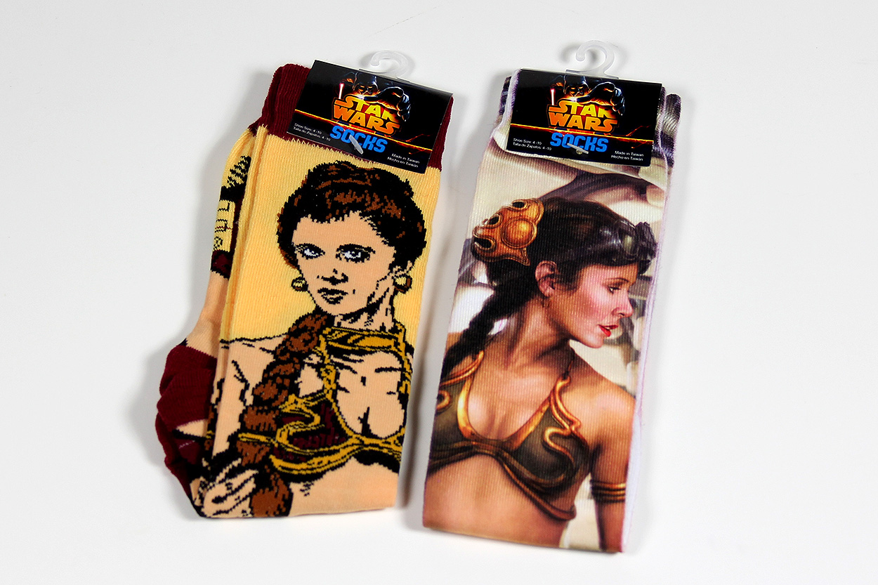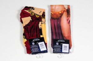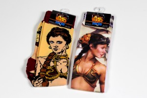 I have a number of Princess Leia saved searches on ebay, and included in one of my daily emails was a listing for Slave Leia socks! I had never seen these before, so I hastily clicked the link to learn more. They were for sale from one of my bookmarked ebay stores of Star Wars items, so I did a routine check of their other listings, just to see if there was anything else new I might like. Sure enough, there was a listing for a second pair of Slave Leia socks of a completely different design, so I quickly bought both. When they arrived, I noticed the tag has HYP – the same distributors of the Star Wars socks I picked up at Celebration. Both Leia sock pairs are marked ‘shoe size 4-10’, and are officially licensed Lucasfilm products.