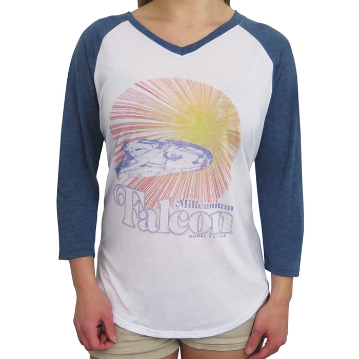 Made from 65% polyester and 35% rayon, this Millennium Falcon baseball shirt for women features, yes, the Millennium Falcon — it’s rendered in a distressed, 70s aesthetic complete with ornate text and an unstable star.