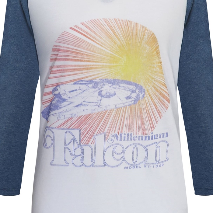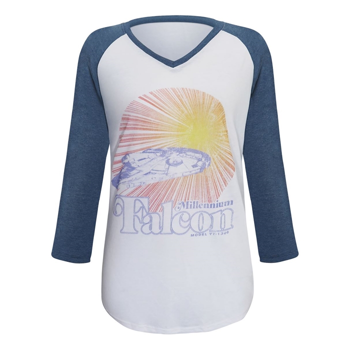 This women’s Solo: A Star Wars Story Millennium Falcon t-shirt is now available at SuperHeroStuff. Made from 65% polyester/35% rayon, the baseball style t-shirt features a front print of Lando’s Millennium Falcon against a hyperspace background design, with the text ‘Millennium Falcon’ underneath. The t-shirt features contrasting raglan style sleeves and contrast neck binding.