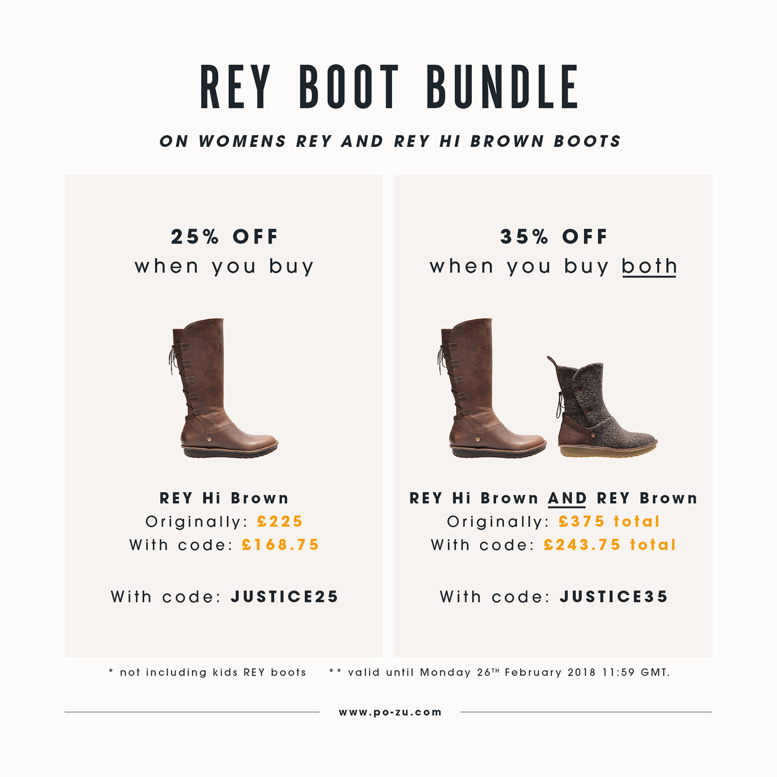 Use code ‘JUSTICE25’ to get 25% off the Rey Hi boots, and use code ‘JUSTICE35’ to save 35% off when you buy the Rey Hi Boots and Rey Brown boots together.
