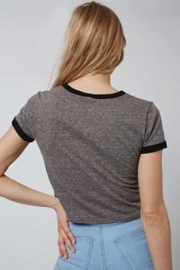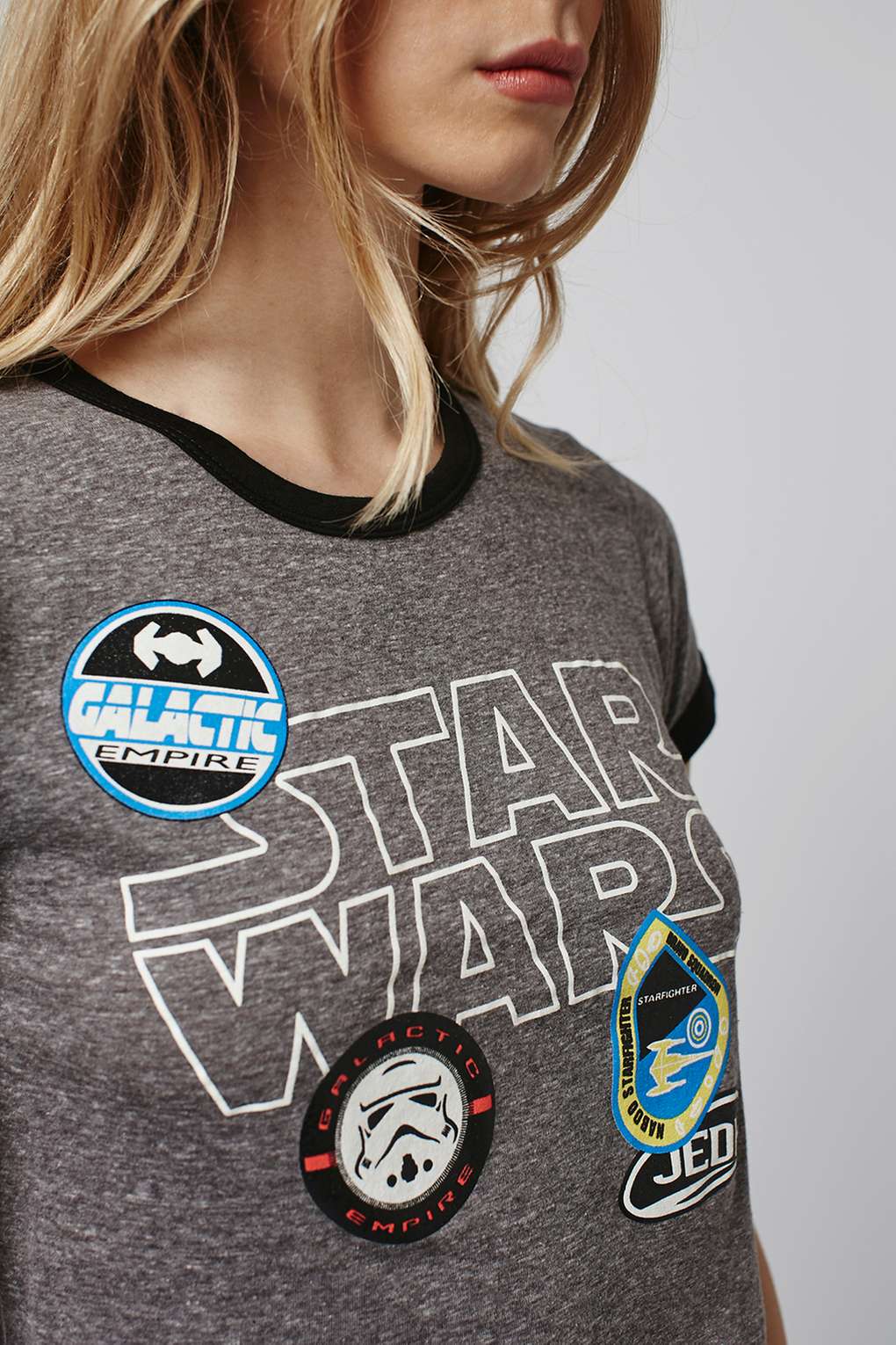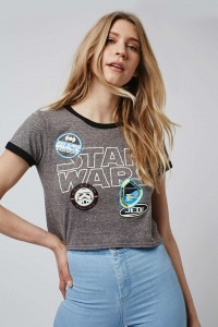 UK based store Topshop has a new women’s Star Wars top available. The heather grey crop tee has black trim around the neckline and sleeves, and features the Star Wars logo printed on the front with four ‘badge’ designs. Priced at £19.00 each, the top is available in UK sizes 4 to 16 – Topshop can ship internationally, which is great.
